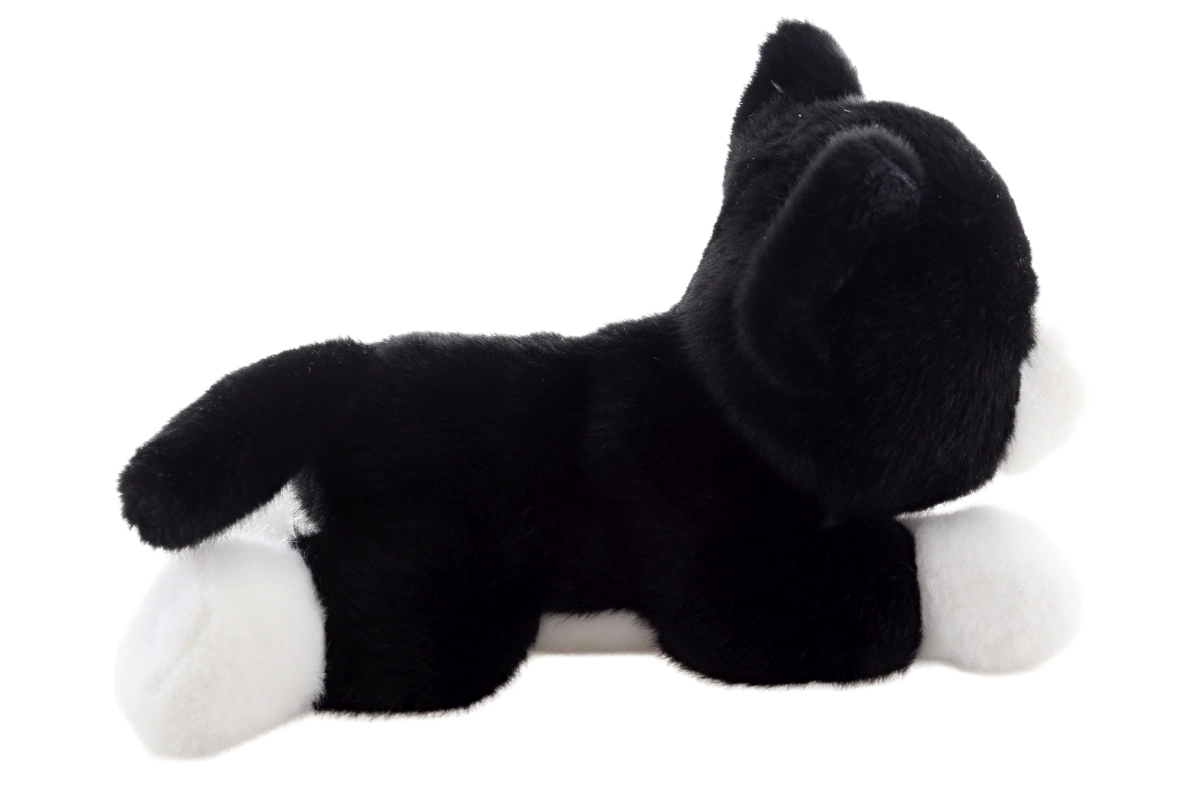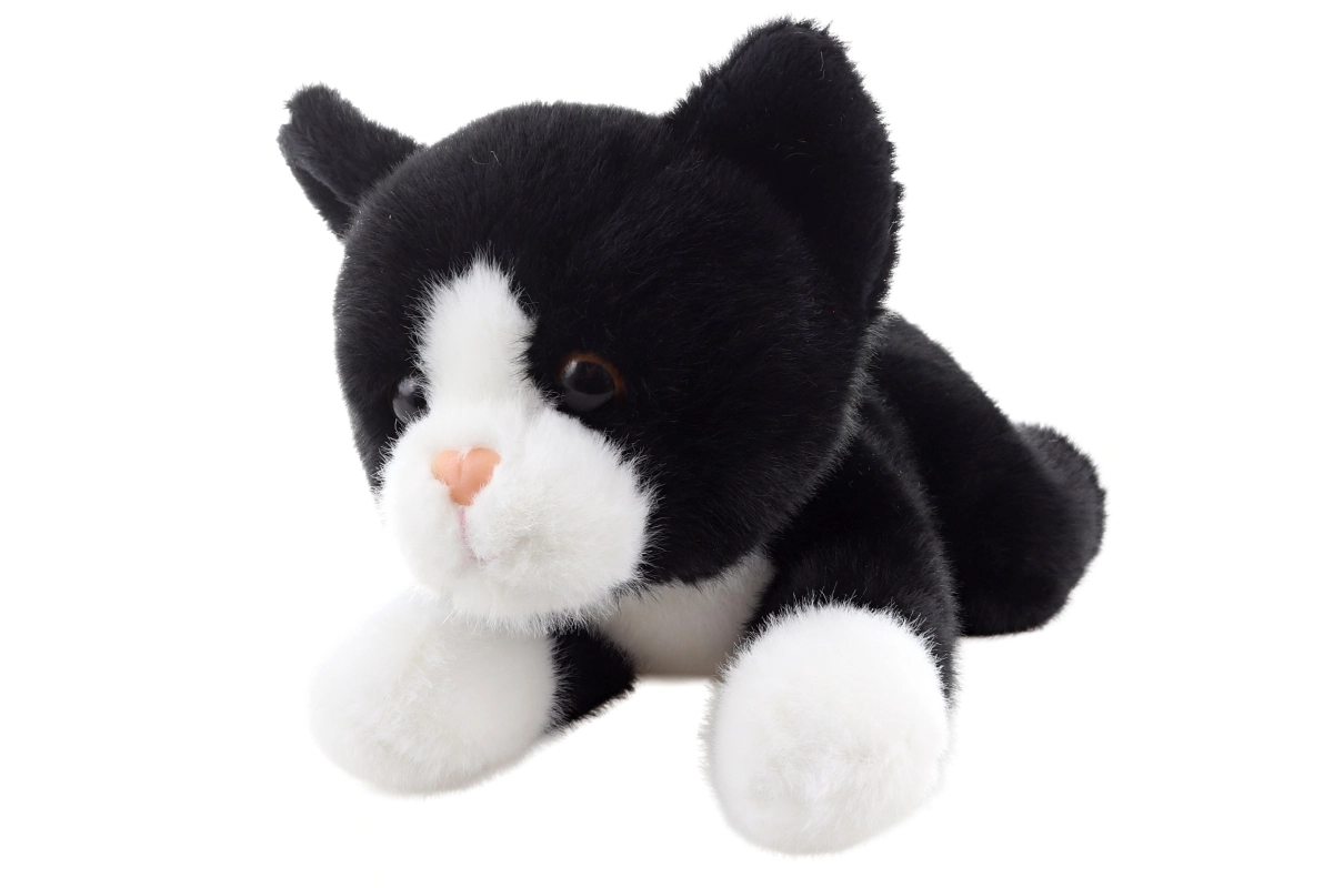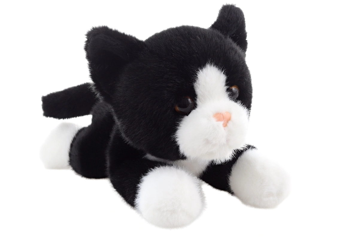 Contrasting black-and-white fur, a pink nose, and embroidered details create the look of a real kitten.
