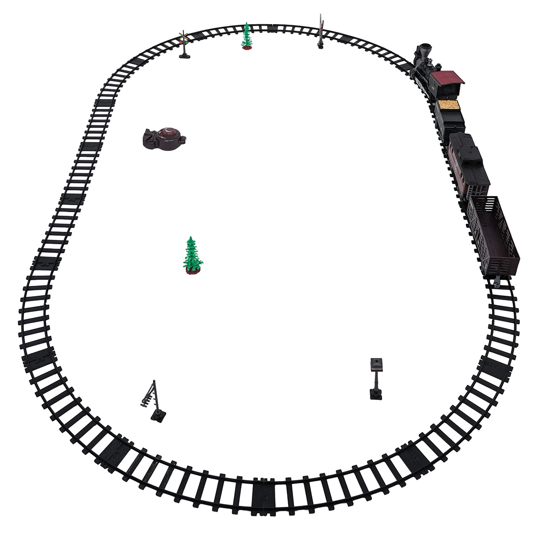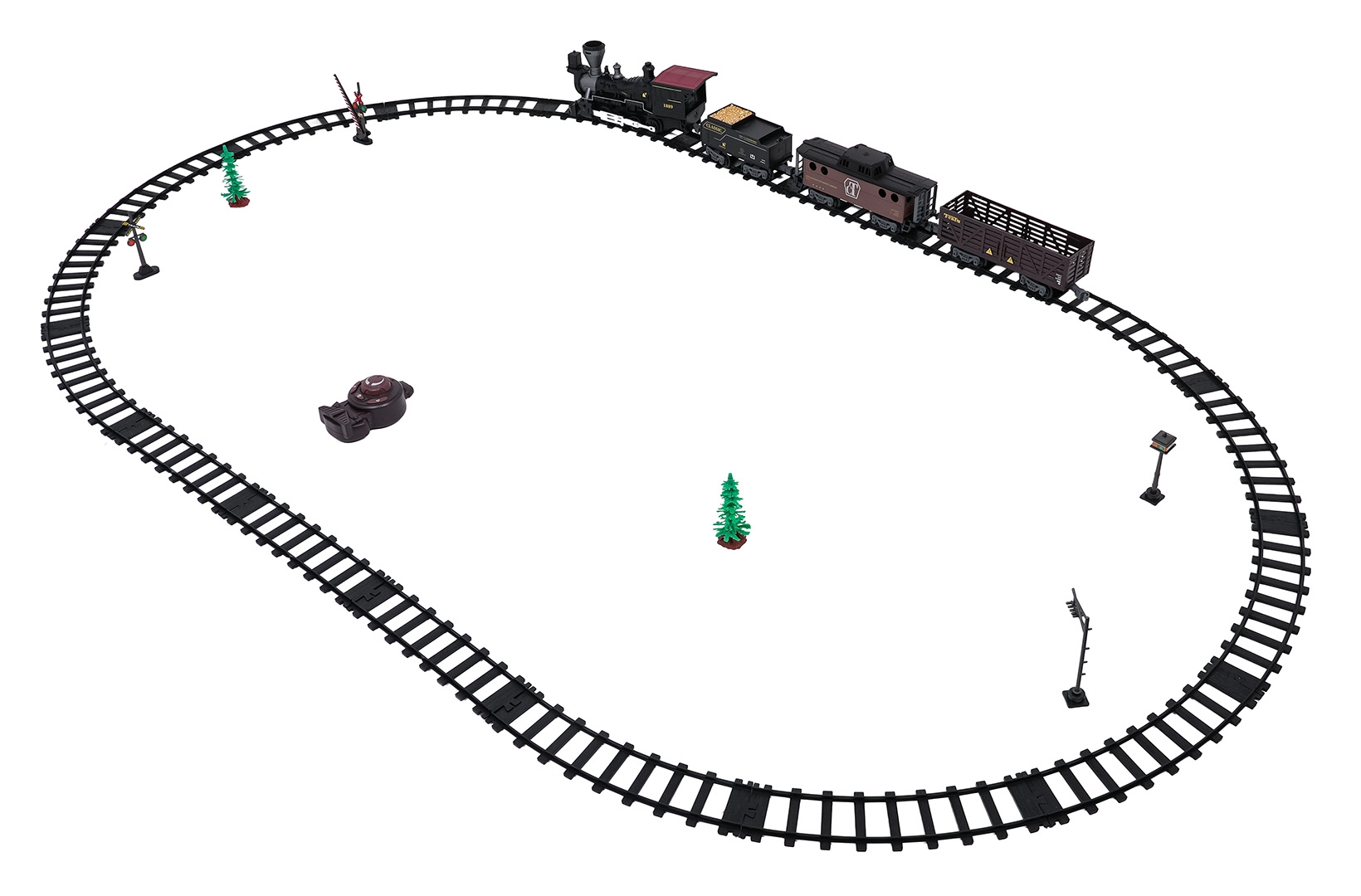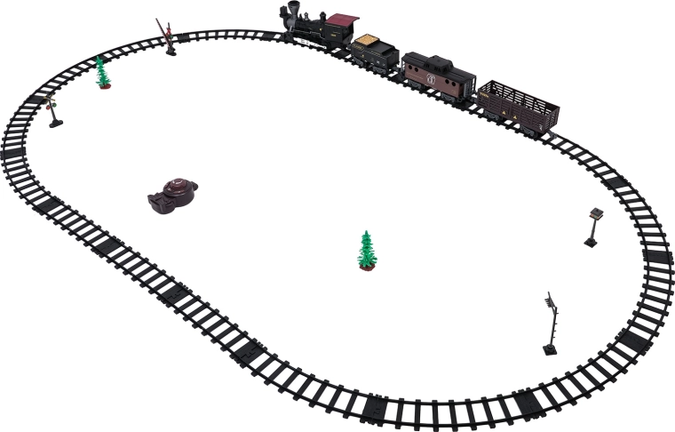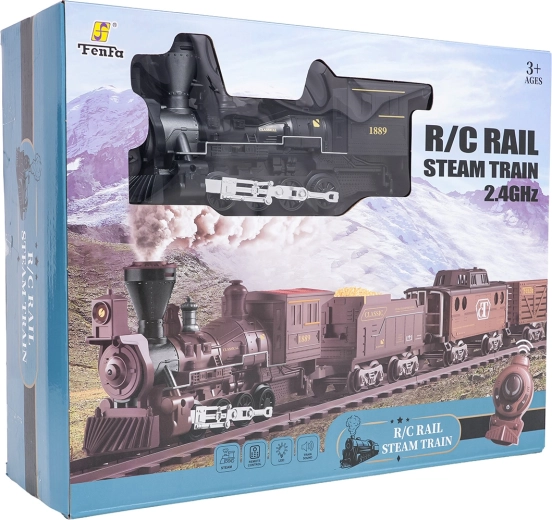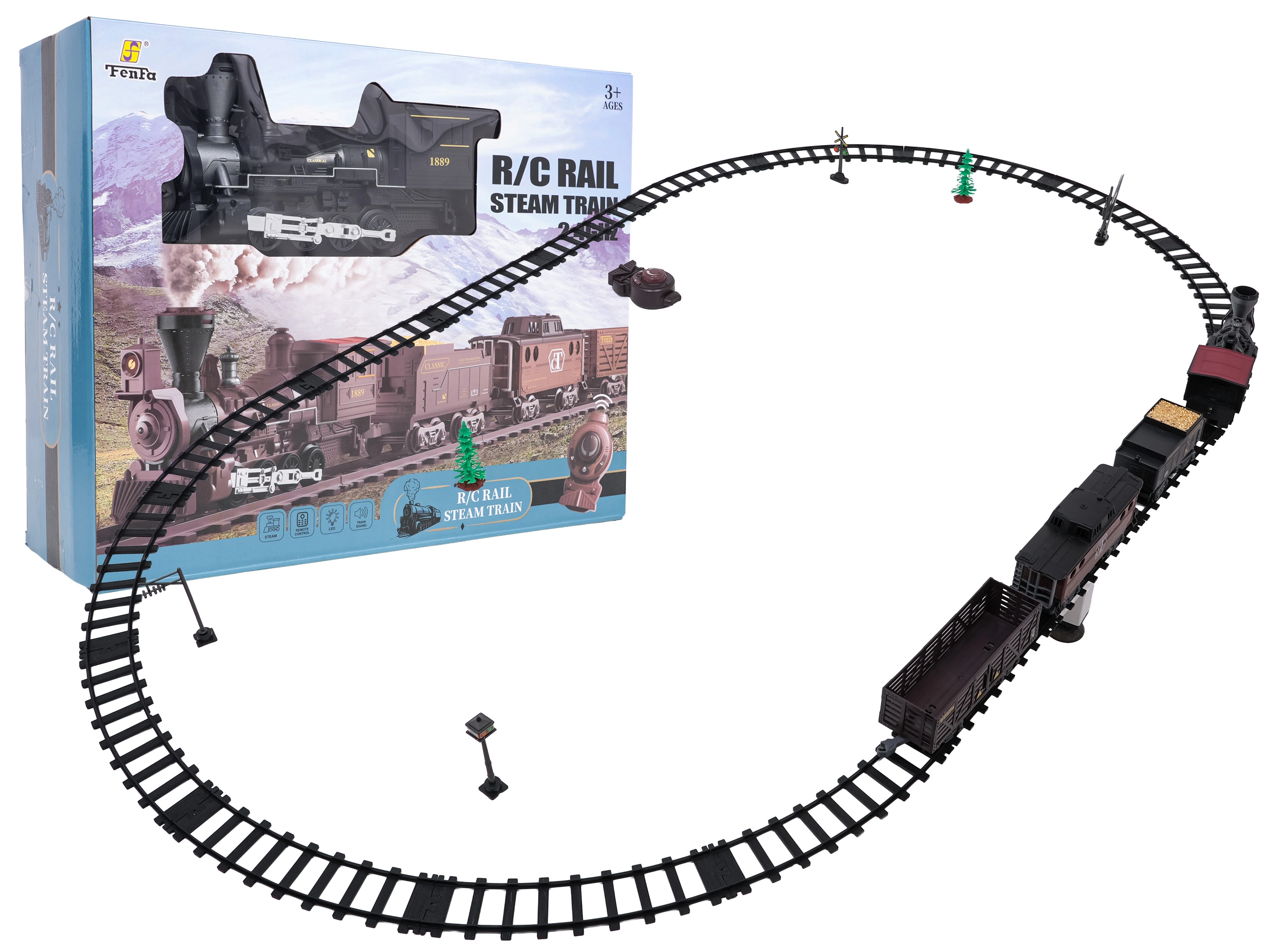 Discover the charm of classic railways with this retro remote-controlled train. The set features a smoke effect from the chimney, a headlight, and realistic running sounds. With 2.4 GHz control, it can go forward and backward, stop, and activate steam. Sturdy, child-safe tracks are easy to assemble and form an oval up to 172 cm long.