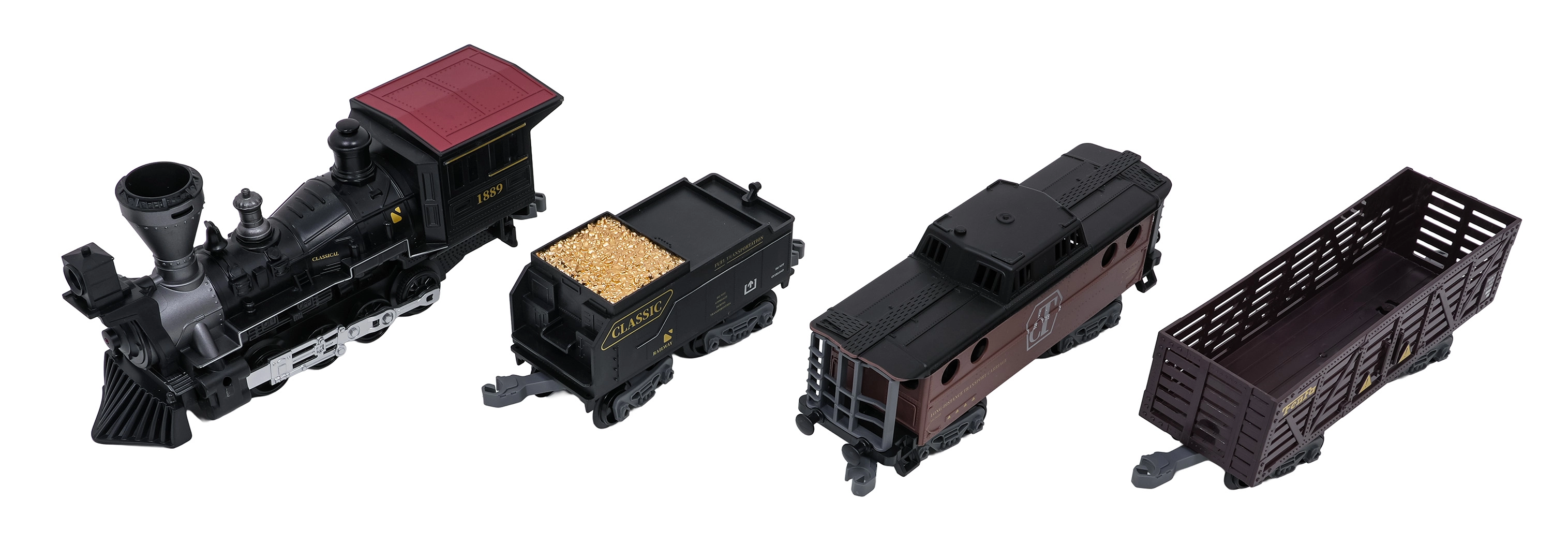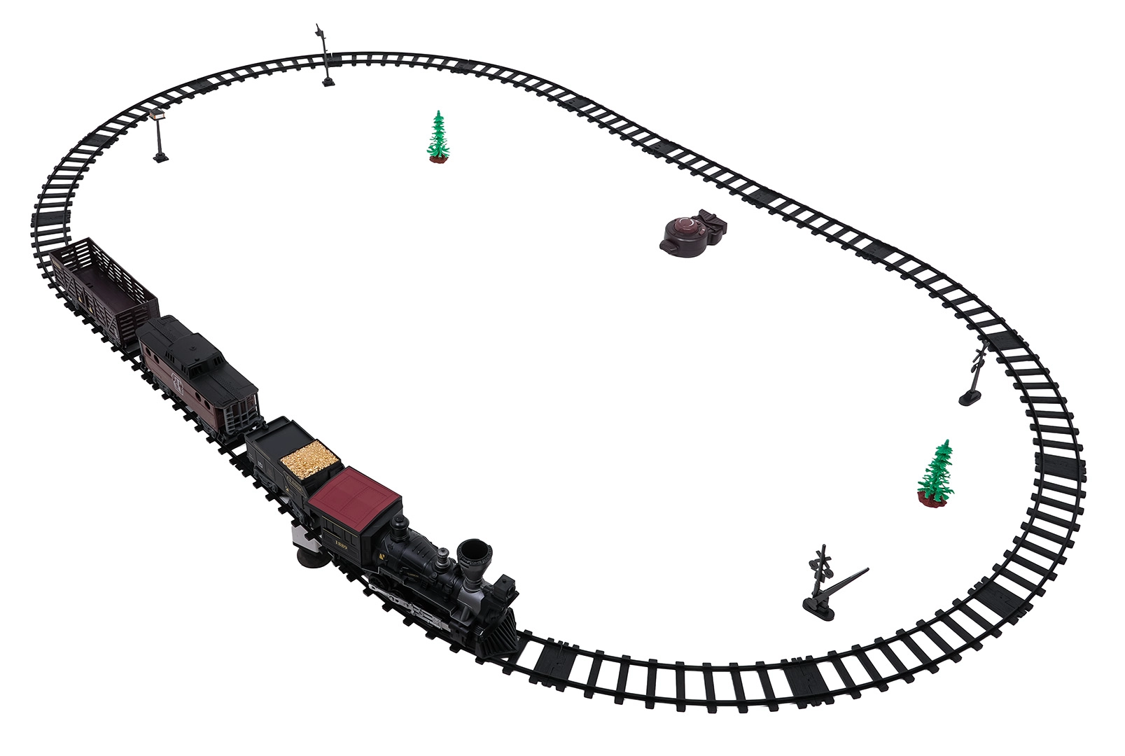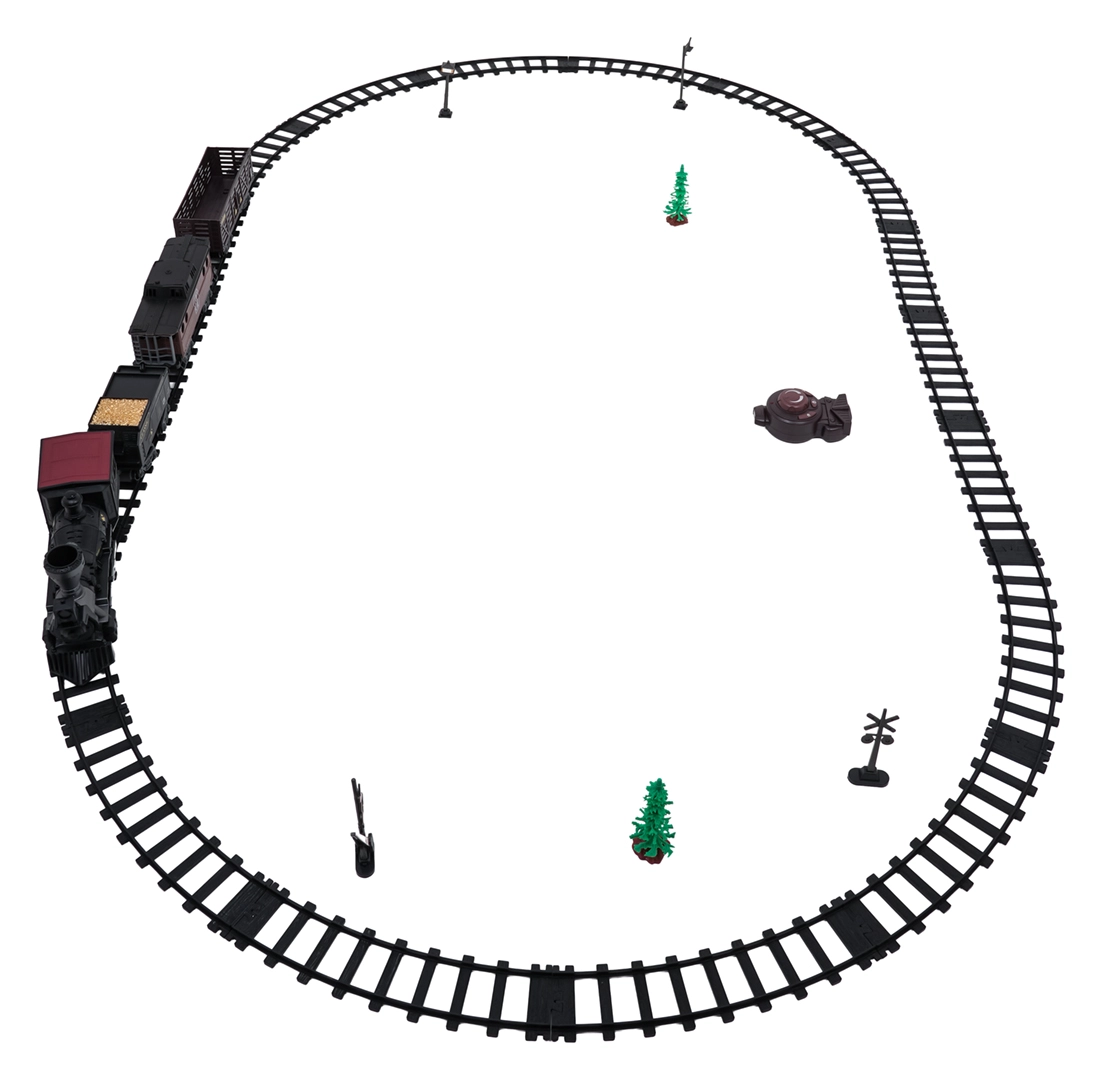 Discover the charm of classic railways with this retro remote-controlled train. The set features a smoke effect from the chimney, a headlight, and realistic running sounds. With 2.4 GHz control, it can go forward and backward, stop, and activate steam. Sturdy, child-safe tracks are easy to assemble and form an oval up to 172 cm long.