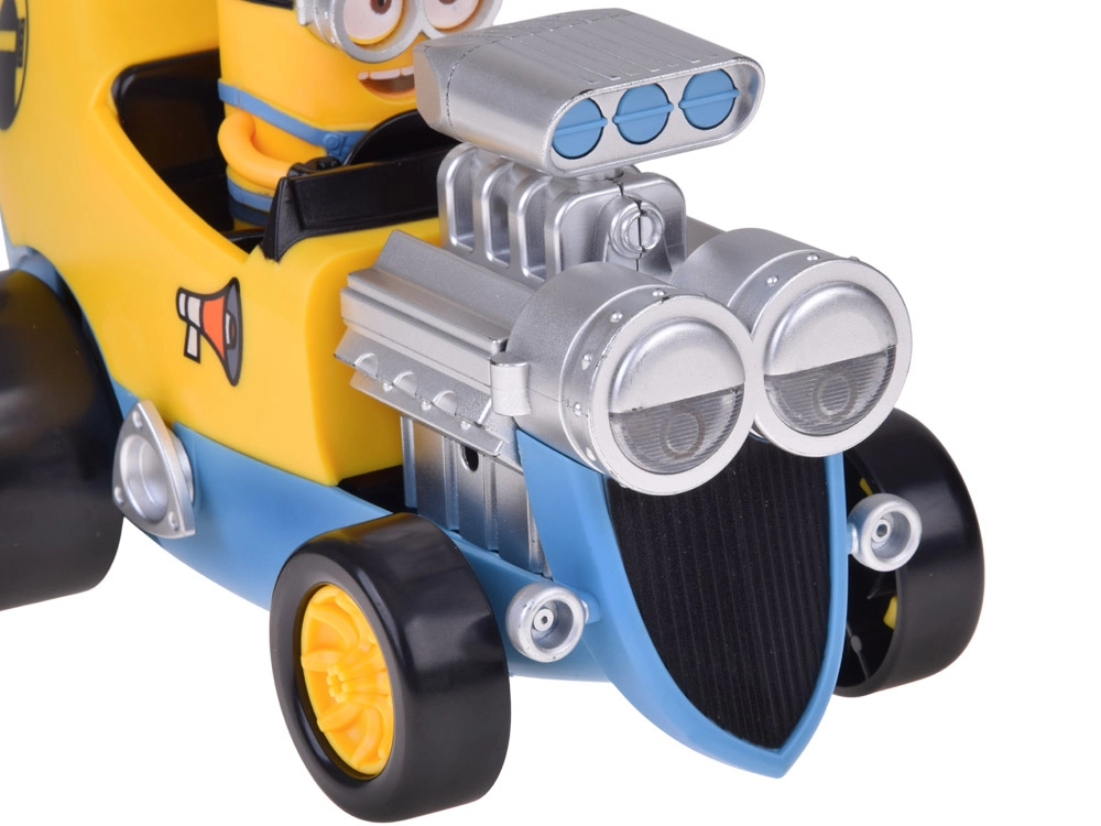 The sturdy plastic build, bold “supercharged” front engine, and freely spinning wheels guarantee tons of action at home or on the go. A great gift for young and older MINIONS fans and playful races full of laughter.