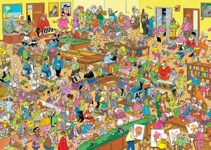 Discover joke after joke in the original illustration “Retirement Home” by Jan van Haasteren, created exclusively for the JUMBO brand. The signature style full of humor, numerous characters, and unexpected situations will draw you in and won’t let go.