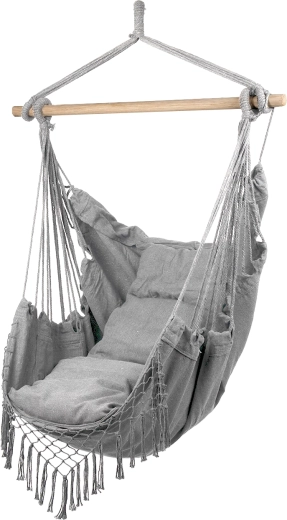 Enjoy relaxing in the garden or at home with this stylish hammock-style hanging chair. It offers comfortable seating with soft cushions, a solid wooden spreader bar for stability, and a load capacity up to 120 kg. Practical side pockets keep your phone, book, or small items within easy reach.