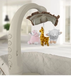 - Soothing features: melodies, night light with adjustable brightness, vibrations, plush toys on the mobile.