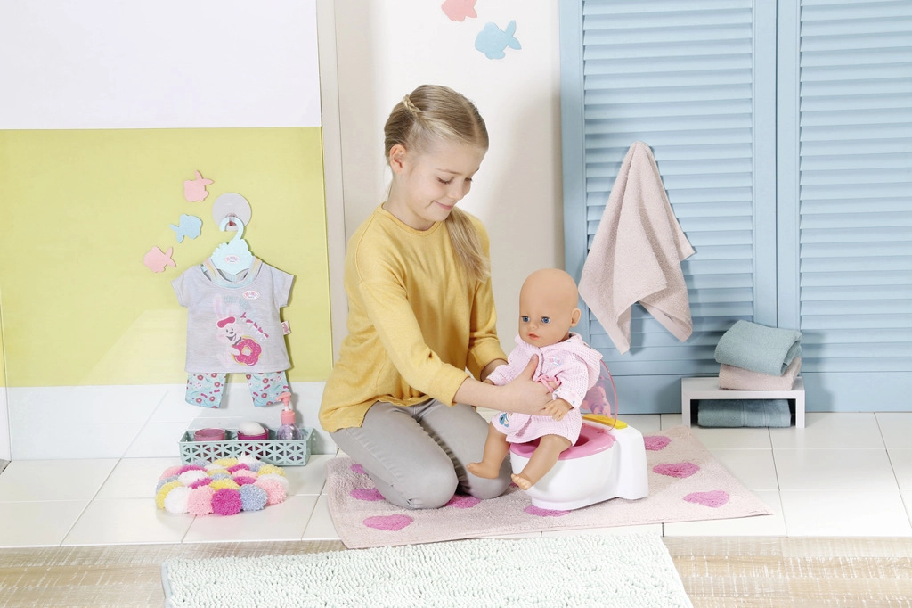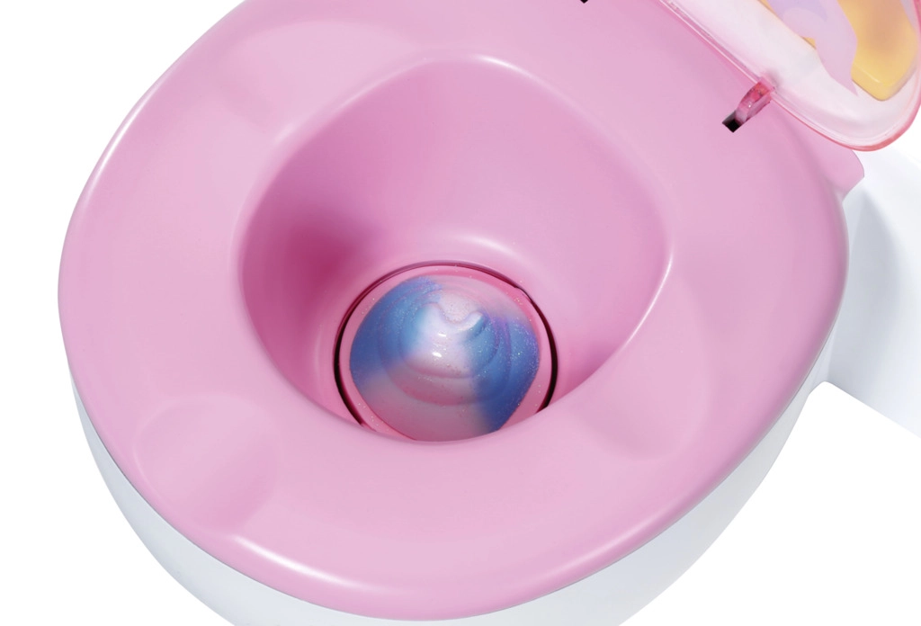 BABY born is already using the toilet! As soon as she sits on her white throne with a pink seat, you’ll hear peeing sounds, applause, and cheerful laughter. BABY born can also poop. In that case, colorful glittery poop appears in the bowl. Quick, it’s time to flush! When you press the flush button, the poop disappears and you’ll hear flushing sounds.