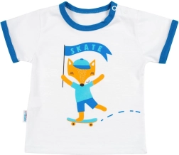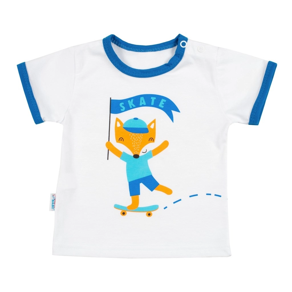 Cute two-piece New Baby set with a fox motif, ideal for summer. Includes a short-sleeve T-shirt and comfy shorts made of 100% cotton. The T-shirt features practical shoulder snaps for easy dressing and is decorated with a cheerful fox print with the text SKATE. Solid-color shorts with an elastic waistband ensure maximum comfort for your little one.