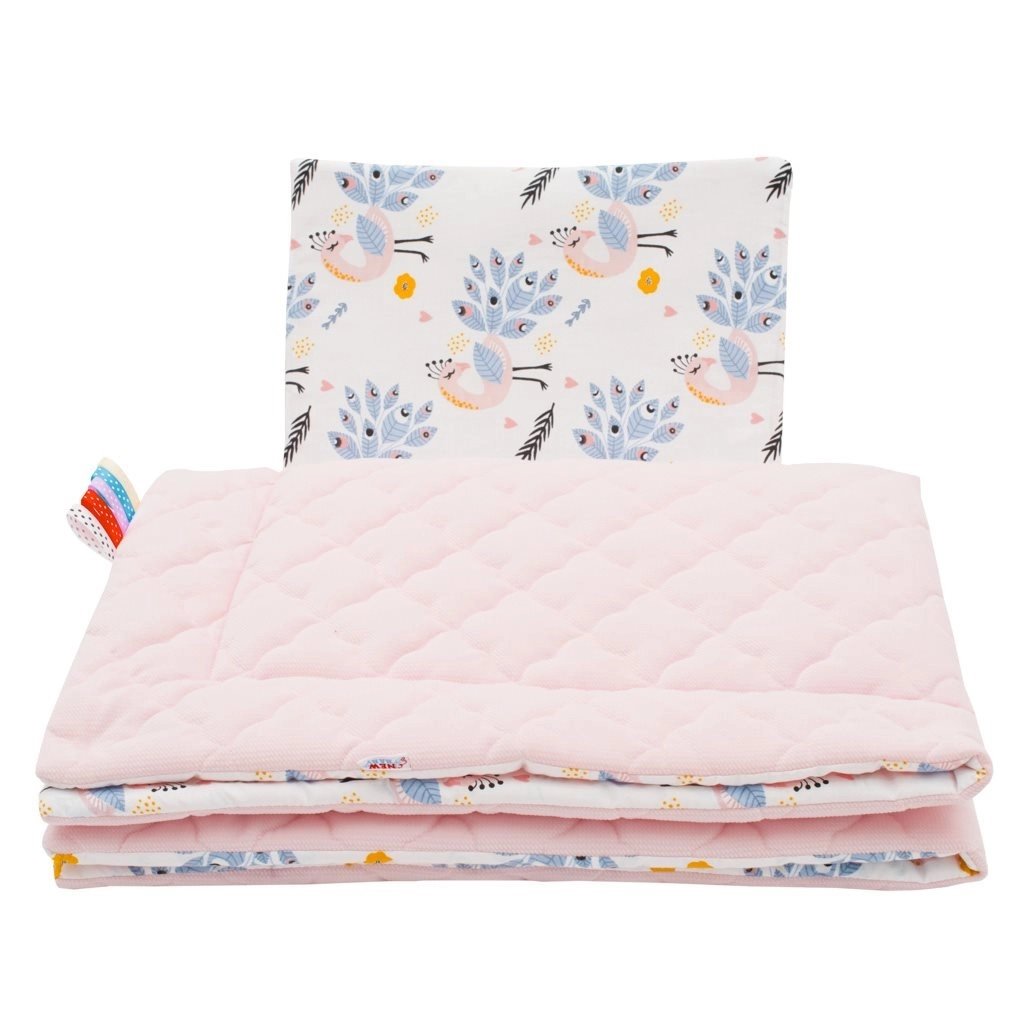 This elegant double-sided stroller set in pink with a peacock motif offers a perfect blend of practicality and softness. One side is quality 100% cotton with a modern children’s print, the other is velvet (100% polyester), exceptionally pleasant to the touch and shape-retaining over time. Everything is filled with anti-allergenic fiber for the safety and comfort of sensitive baby skin.