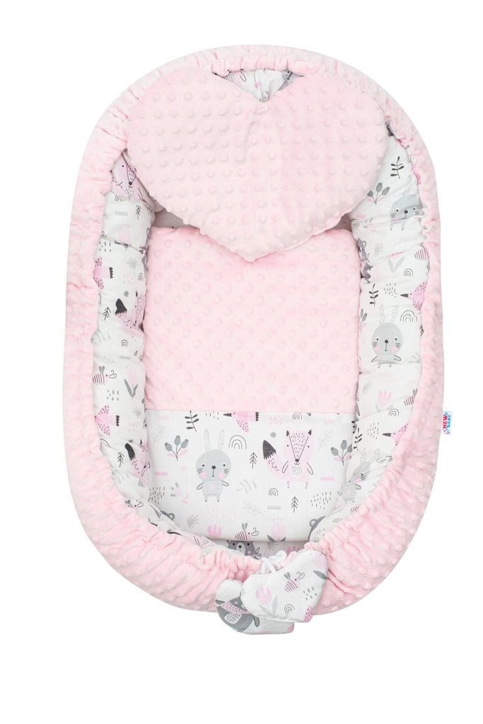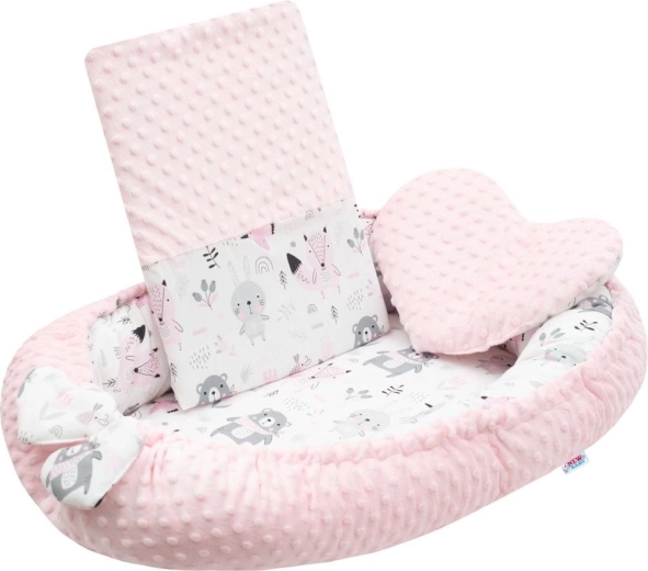 Give your baby a safe and cozy environment with this reversible NEW BABY nest made from soft minky fabric and 100% cotton. It includes a heart-shaped pillow and a duvet, a practical drawstring for size adjustment, and raised edges for extra comfort and a sense of security. Ideal for a crib, stroller, or couch. Soft minky, reversible design, adjustable size, anti-allergic filling.