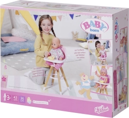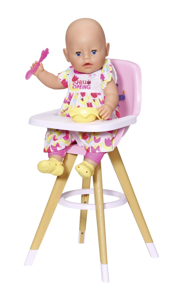 This modern BABY born doll high chair combines a Scandinavian look with functional design for everyday play. Stable, outward-angled legs with a wooden appearance and a circular footrest ensure confidence while serving treats. The pink seat with a high backrest and a cute print provides comfortable seating for the doll.