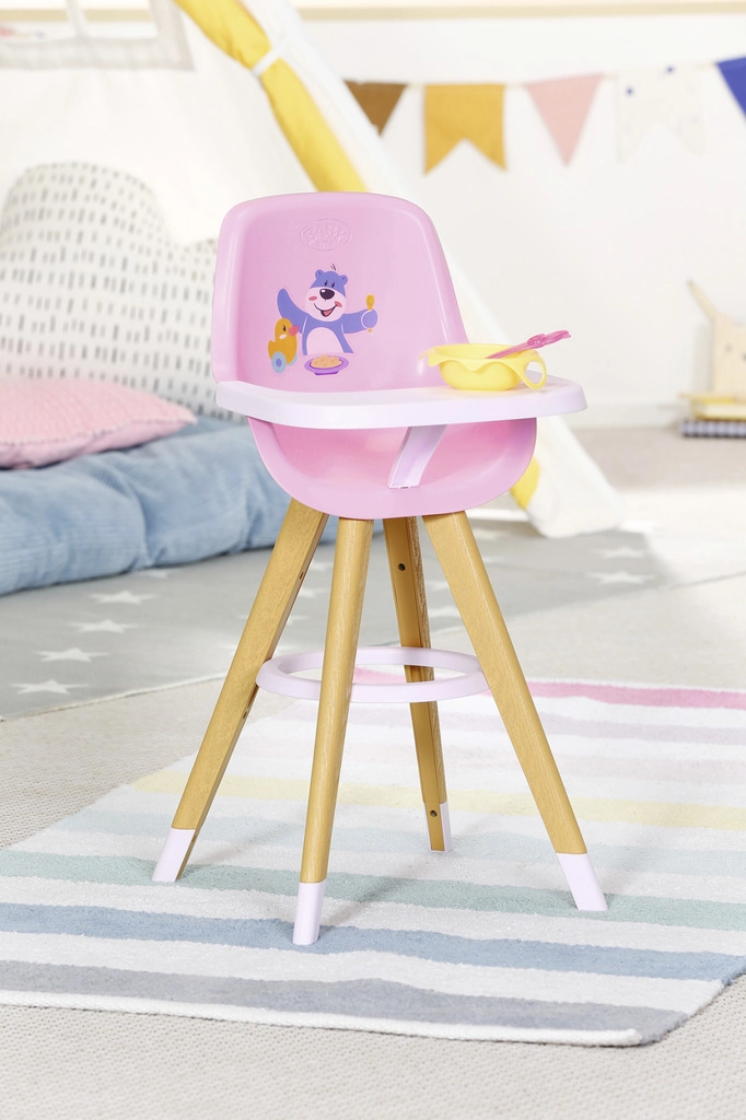 A stylish BABY born doll high chair in Scandinavian design brings kids creative feeding play. It features stable wood-look legs, a comfortable pink seat, and a removable tray with plenty of space for a plate, bottle, and other accessories. The cute bear and duck print delights little caregivers, and the chair also fits smaller dolls.