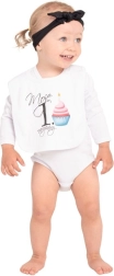 Adorable pink bib NEW BABY with the inscription mom + dad = me protects clothing during meals and drinks. It is made of 100% cotton, has a double layer, a certified print safe for babies, and a comfortable snap fastening.