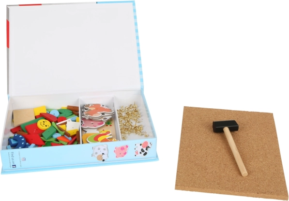 The creative Hammering Game On the Farm develops fine motor skills, creativity, and shape recognition. Using a small hammer and colorful pieces, children create farm scenes on a cork board – fun with an educational twist! The pieces have pre-made holes for easier and safer hammering.