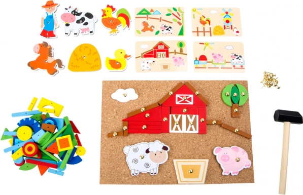 Children arrange and hammer shapes onto the cork board, training coordination, precision, and imagination while creating farm scenes.