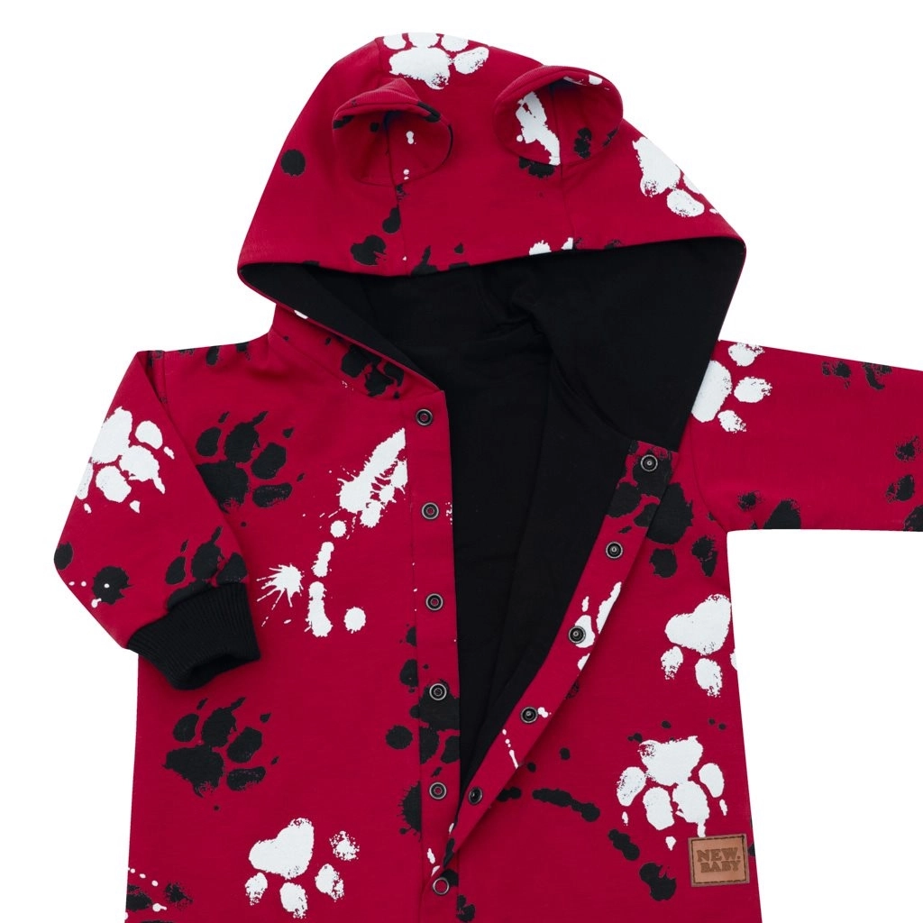 A cute and comfortable NEW BABY Paw onesie for everyday wear. Made from quality cotton with a touch of elastane, it features a soft cotton lining and snap fastening along the full length for easy dressing and diaper changes. A hood with ears, wider elastic cuffs, and a warm interior ensure coziness and comfort. Ideal for spring and autumn.