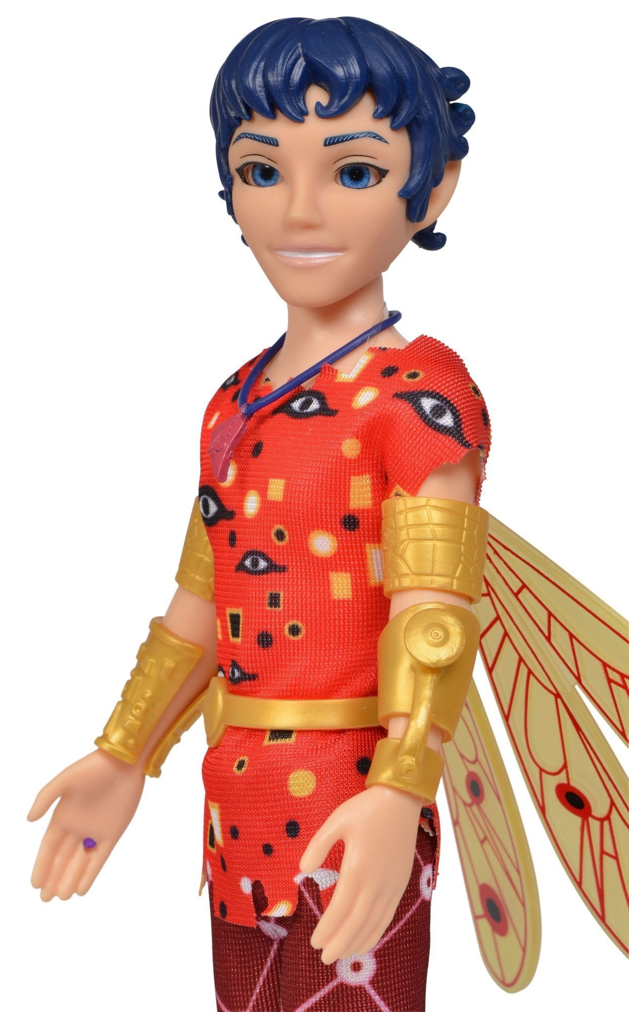 The Mo doll faithfully captures the popular elf and prince from the magical land of Centopia. He has short dark blue hair, blue eyes, and the iconic outfit with a red patterned shirt, burgundy pants, and a gold belt. He wears a blue necklace with a red stone and stylish bracelets on his arms.
