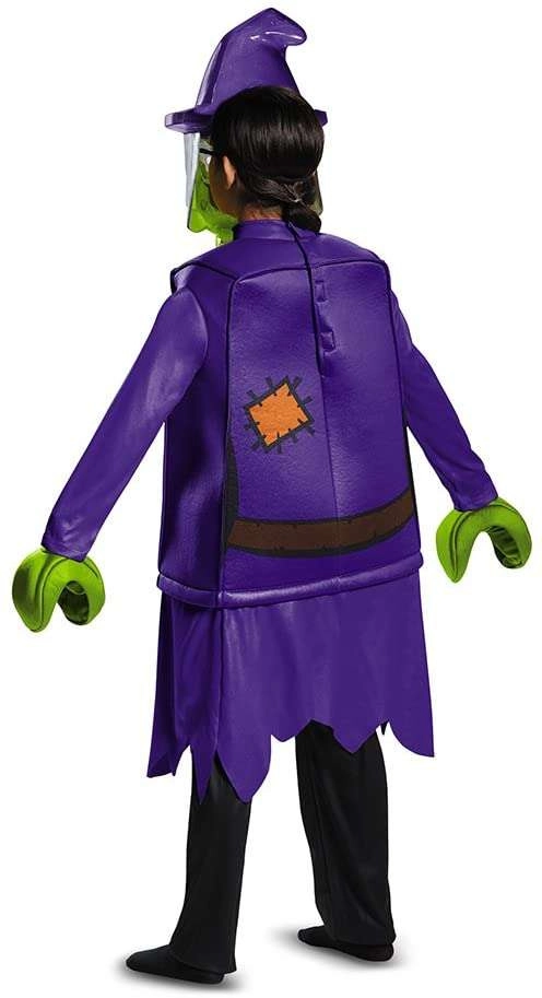 Turn little sorceresses into a blocky character with this original LEGO-style costume. The set includes a purple tunic, a witch head mask with a purple hat, green claw gloves, and black pants. The mask has a mesh eye panel for good visibility, an elastic strap for a secure fit, and soft padding for comfort. Ideal for carnivals, Halloween, and everyday dress-up play.