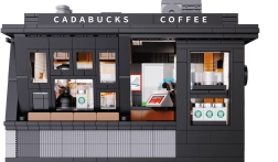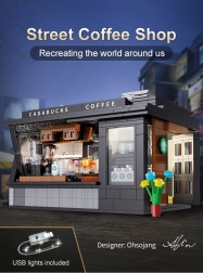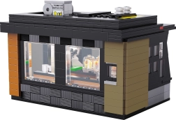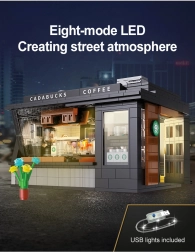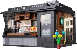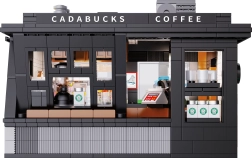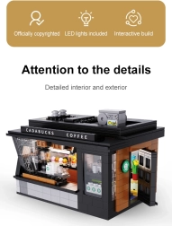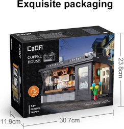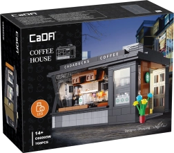 Build your own mini café with the Cadabucks Coffee House by CaDA. The set includes 768 pieces, a detailed barista area and customer zone, and functional LED lighting for an authentic atmosphere. A removable rear panel and roof provide easy access inside, with shop windows, signs, doors, and many realistic accessories included.