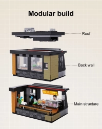 Create a stylish shop window and cozy interior with a coffee machine, dessert display case, cups, and decorations. Thanks to the USB LED strip, the café gets a unique coffeehouse vibe both day and night. The modular build with a removable roof and rear wall makes both play and shelf display easy.