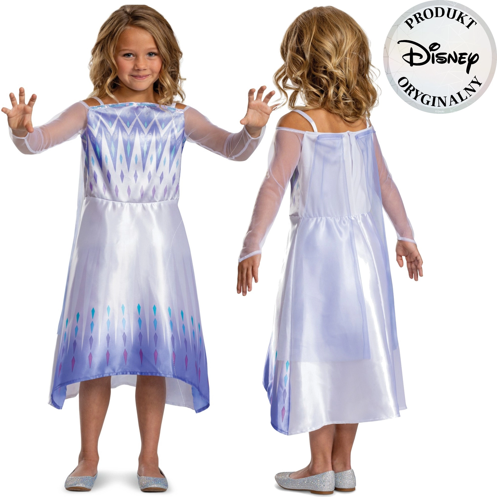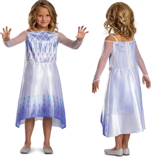 Turn everyday play into an icy kingdom with a costume inspired by ELSA from DISNEY FROZEN. The dress in soft tones of white, lilac, and silver has sheer sleeves, a printed bodice with “icy” motifs, and a flowing skirt with a smooth color transition and delicate diamond patterns.