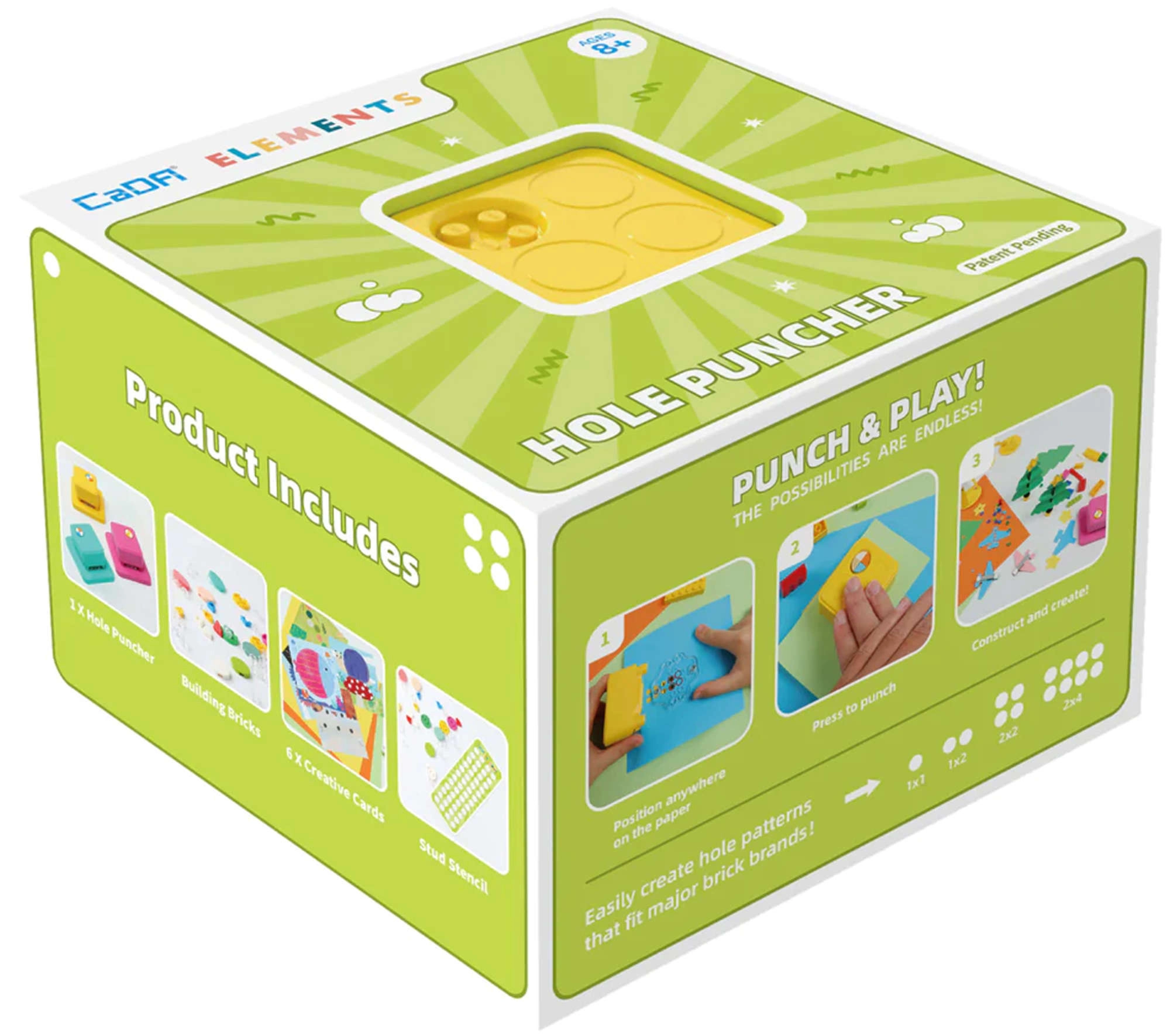 The box includes a punch, 99 bricks, 2 templates, and 6 cards. Just punch, fill the holes with bricks, and create your own design.