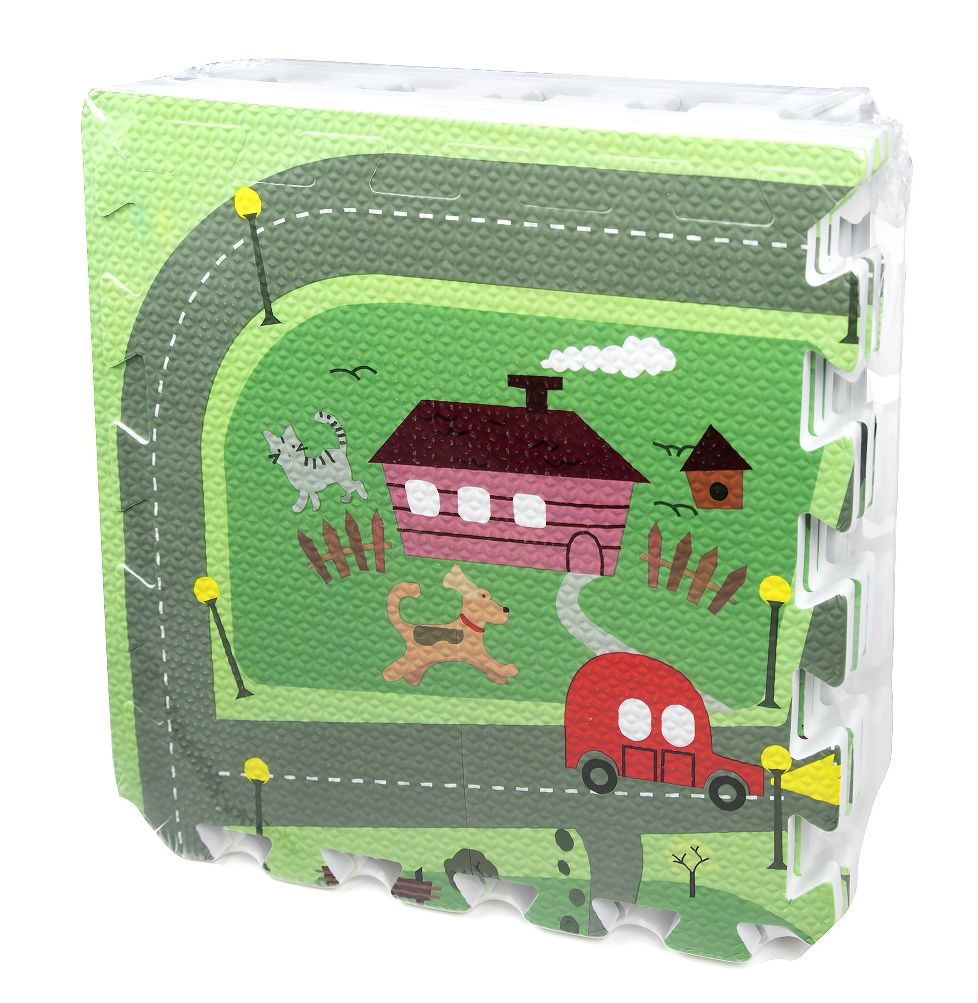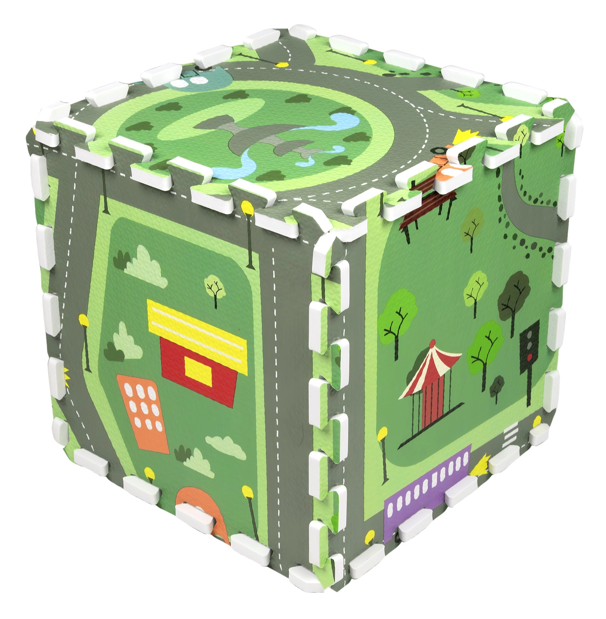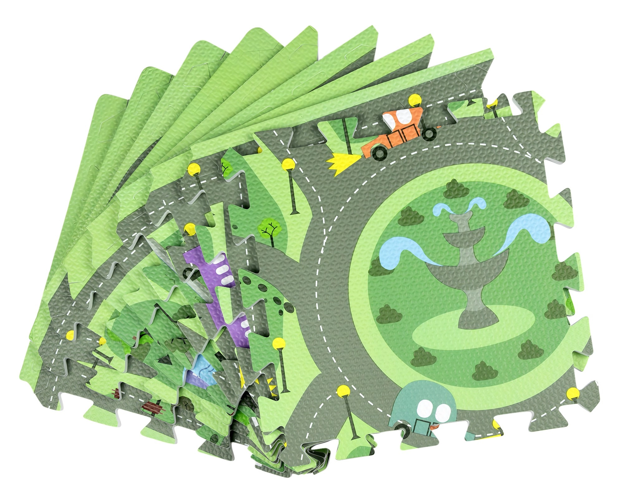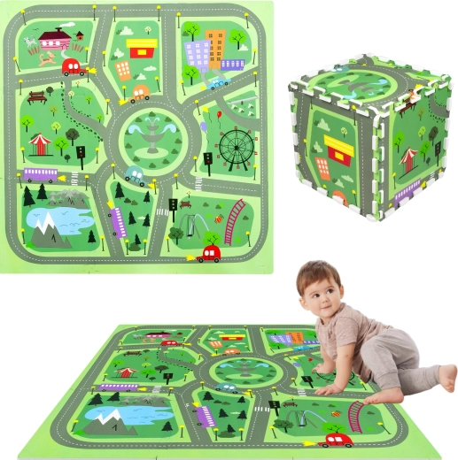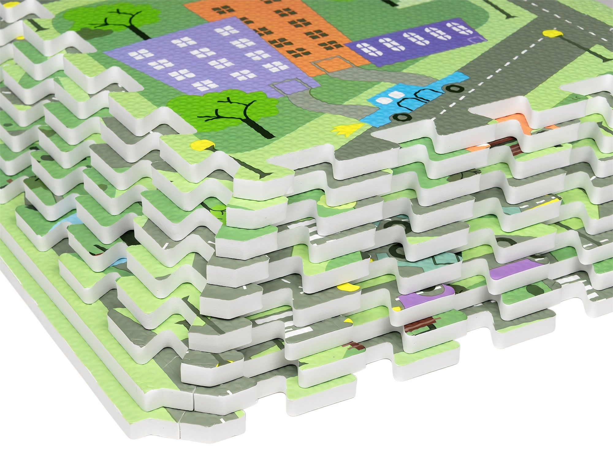 Create a comfortable and hygienic play space for your child. The flexible EVA foam mat is free from phthalates, formamide, PVC, and BPA, features a non-slip surface and subtle textures for more confident first steps. The pastel city streets theme with a roundabout, parks, pond, and buildings stimulates imagination and invites car rides and creative play with figurines.