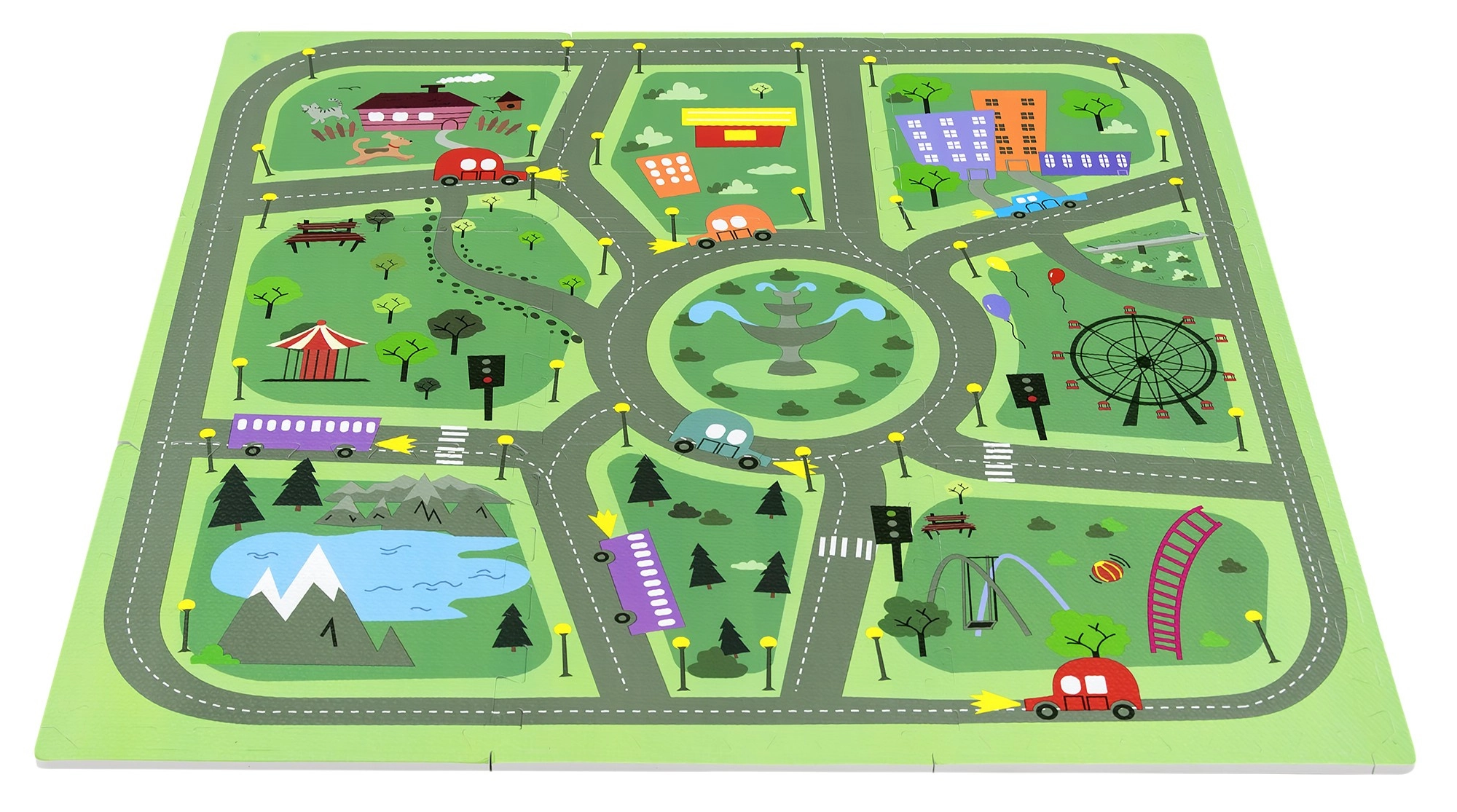 Roads, a roundabout, parks, a pond, buildings, and traffic elements support imagination and early road-safety learning. Perfect for toy cars and figurines.