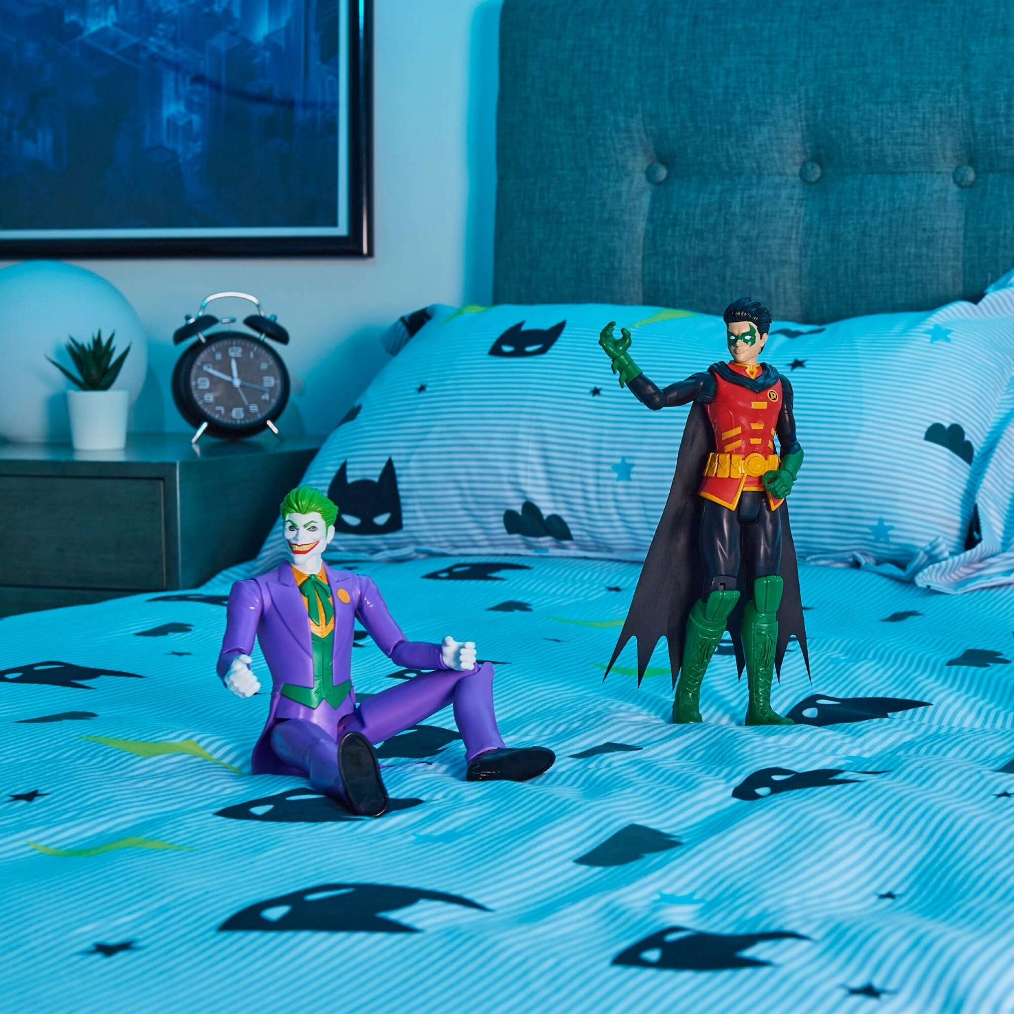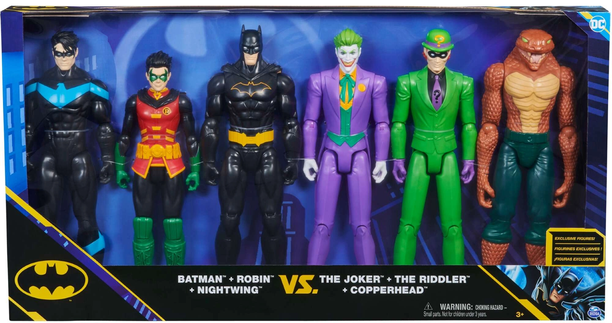 The figures, at a height of approx. 28 cm, are made to withstand everyday play while looking great on a shelf. The set includes: Batman in a black-and-yellow suit with a cape, Robin with a mask, Nightwing in black with blue accents, Joker in his iconic purple suit, Riddler in a green suit with a “?” and Copperhead with a tail.