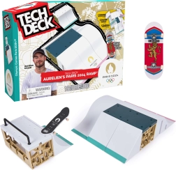 Feel the vibe of Olympic skateboarding with the exclusive Tech Deck Aurelien Giraud Paris 2024 set. Robust plastic parts, quarter-pipe radii, a grind rail, and platforms enable smooth line combinations, ollies, grinds, and gaps — all on a finely detailed mini board.