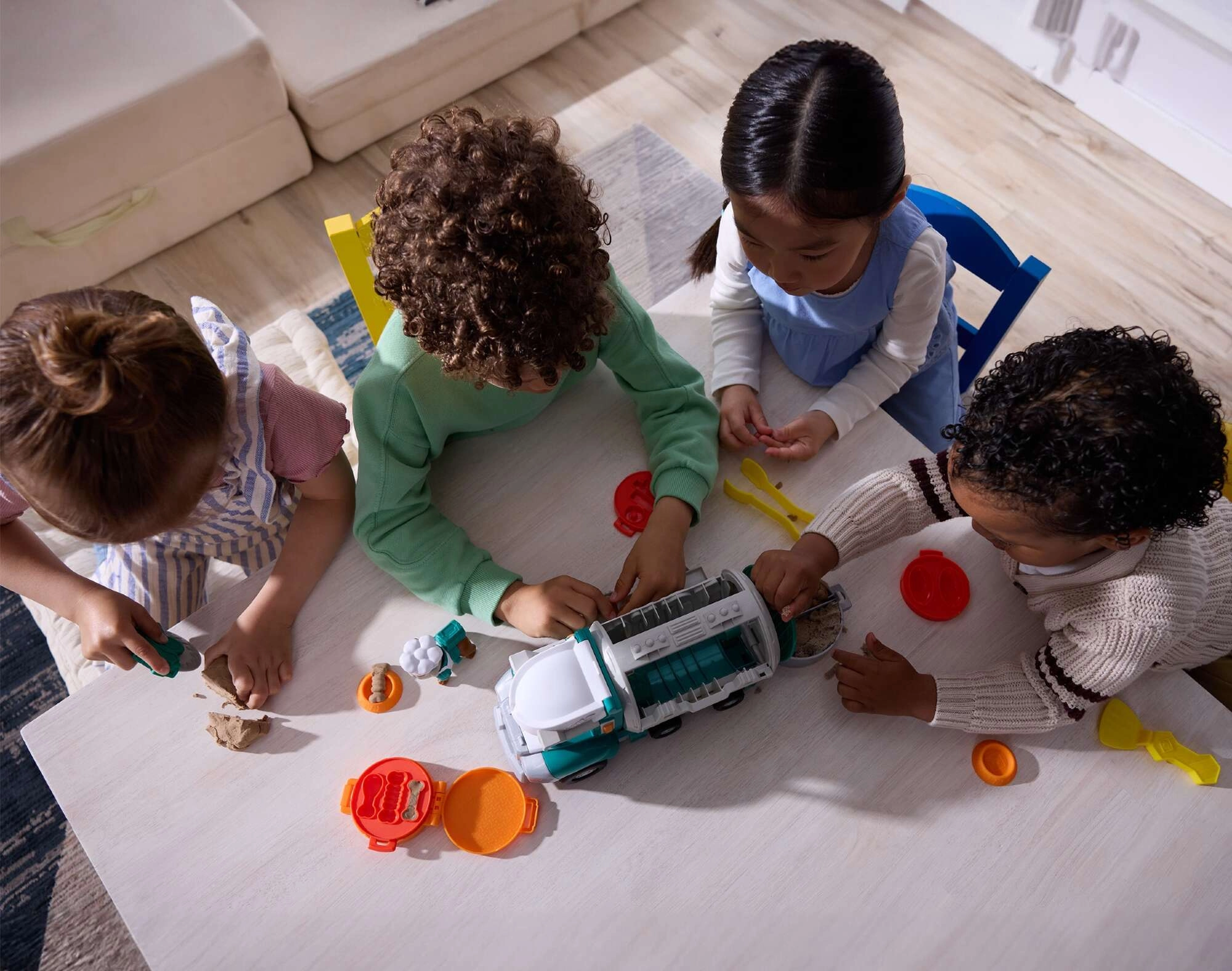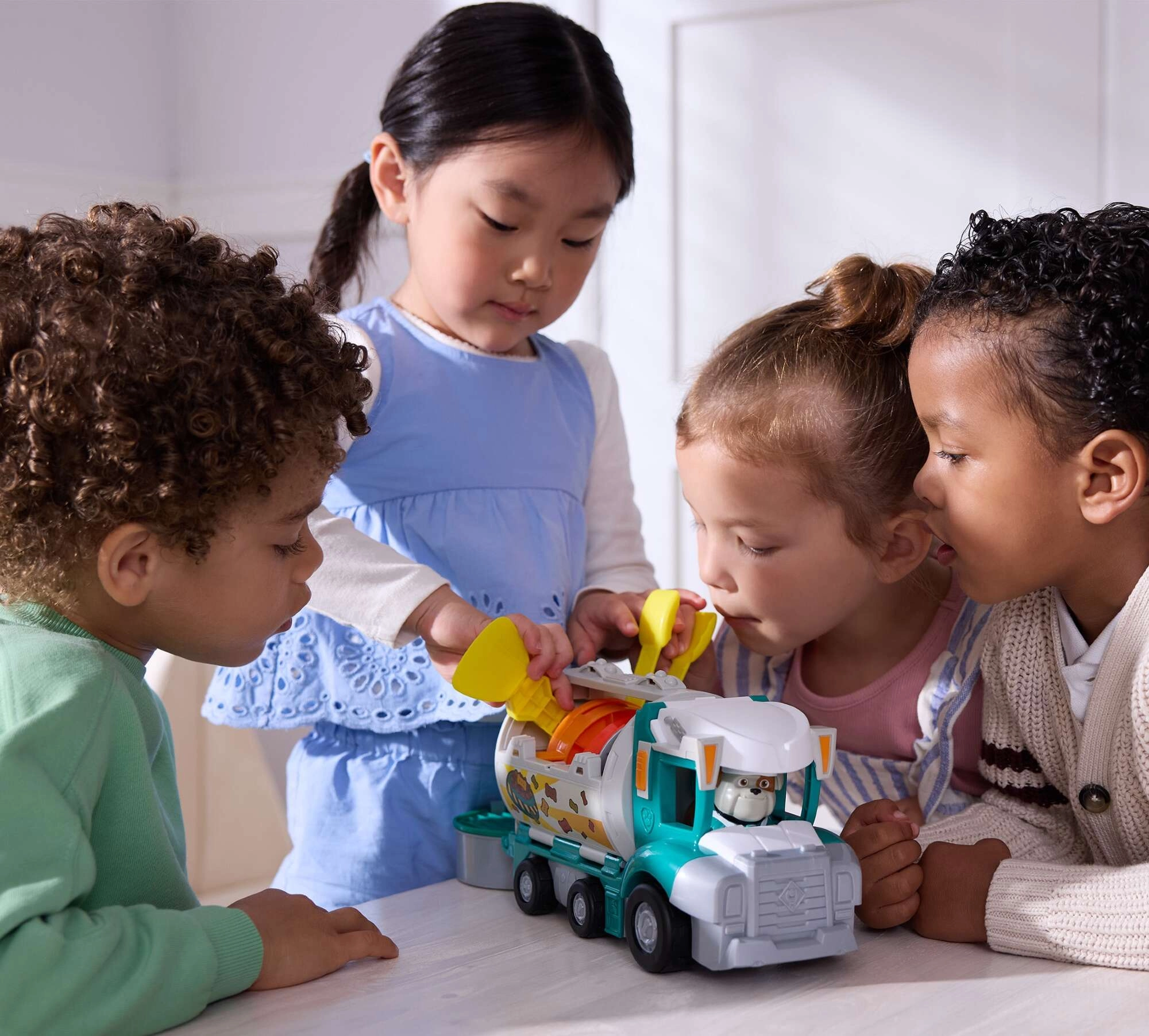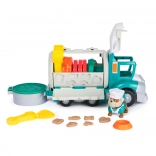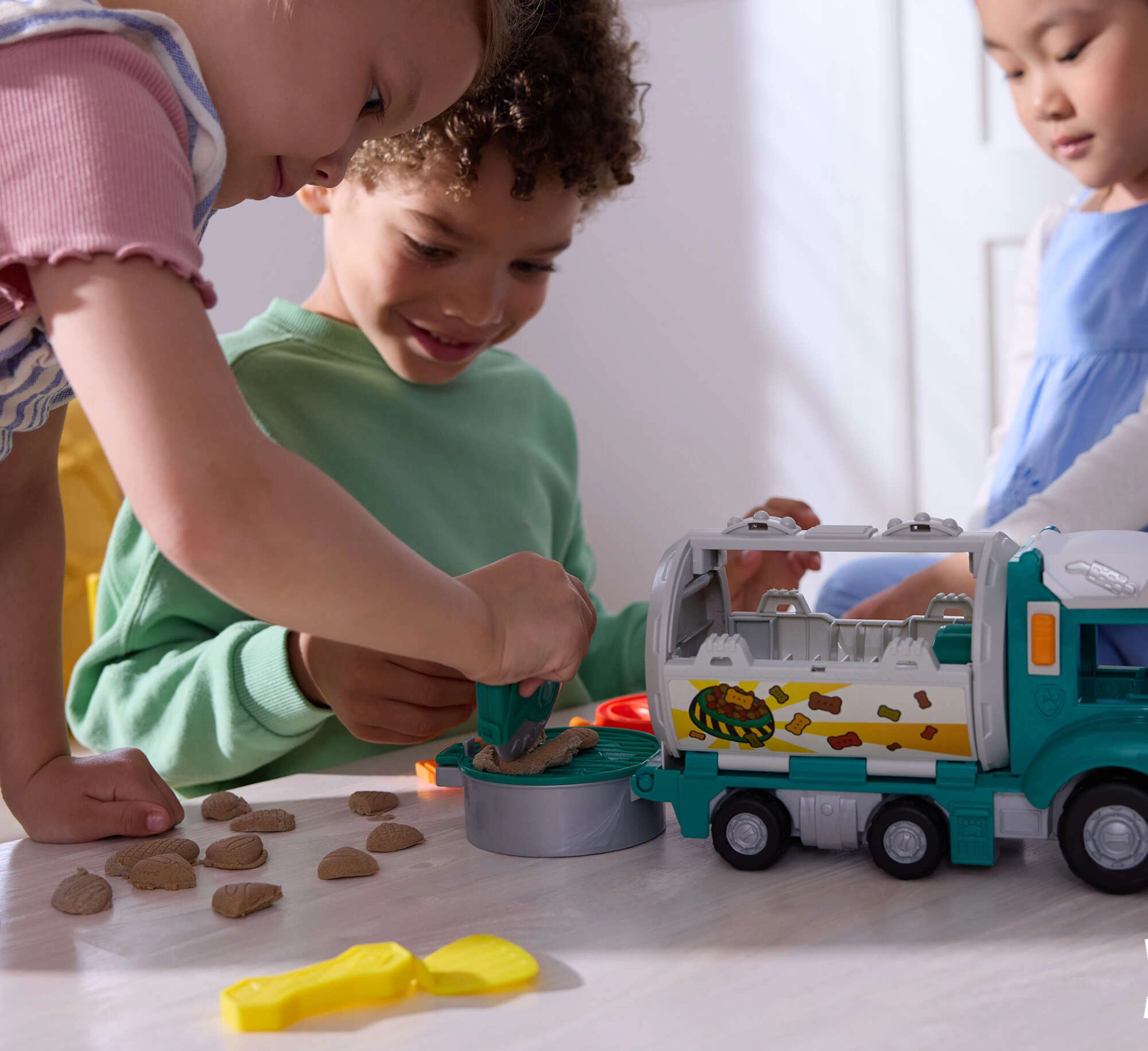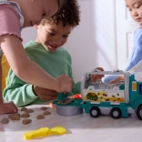 A sturdy vehicle with rolling wheels, compartments, and opening parts offers kids realistic action play – from transporting “materials” to serving treats.