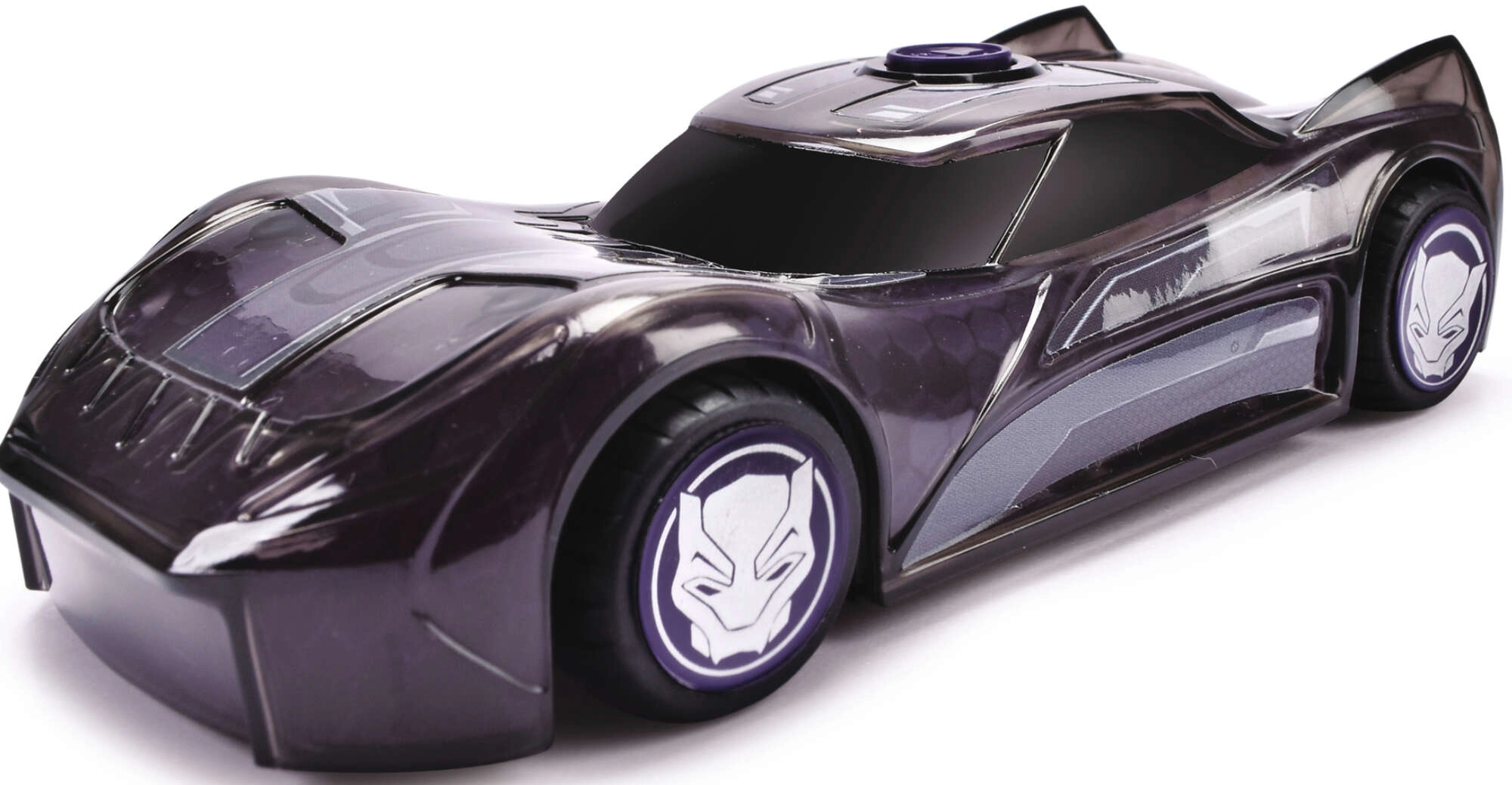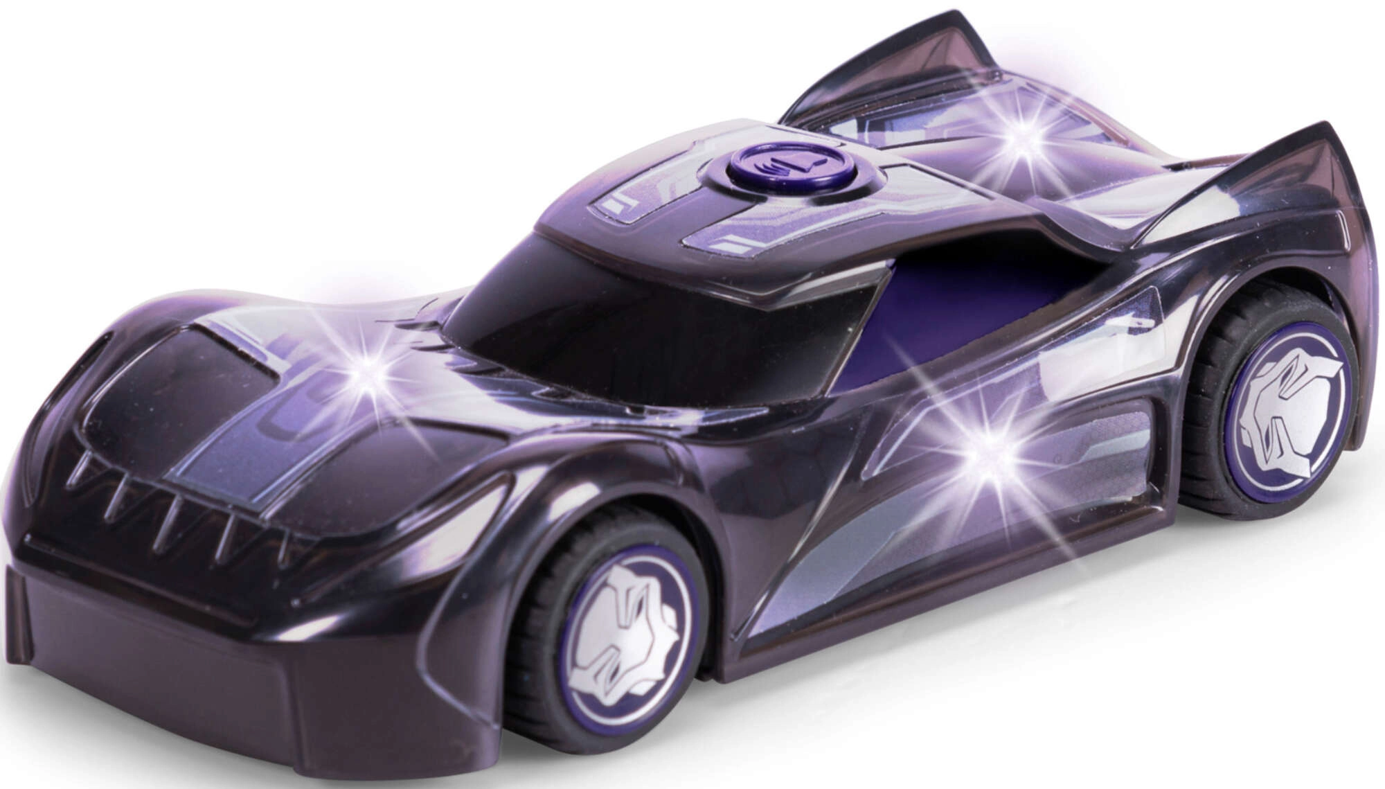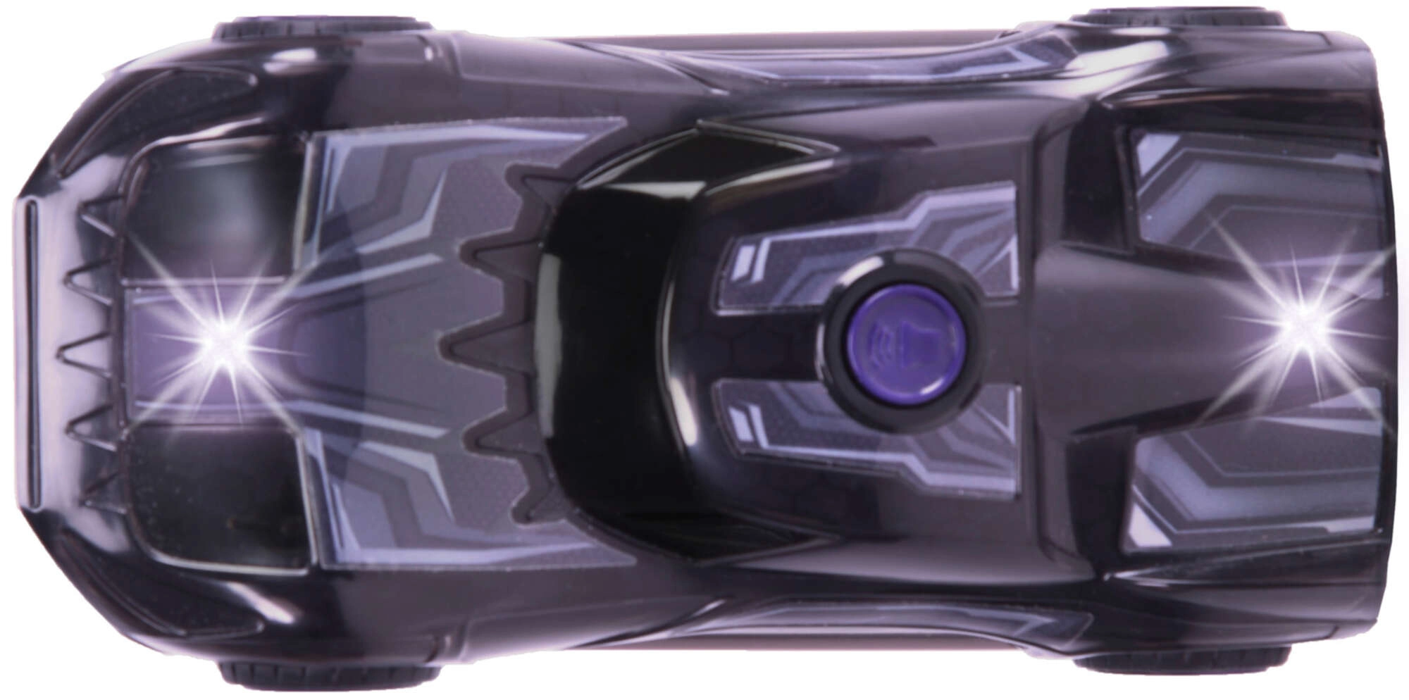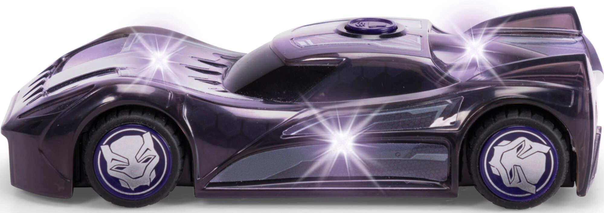 Bright LED effects light up the car and highlight the BLACK PANTHER superhero look — perfect for evening play and action scenes.