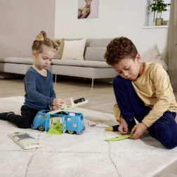 The roof is removable, there’s a detachable surfboard on the rack, and the rear features a flip-up hatch with an “engine” compartment. The durable plastic build is suitable for everyday play and helps develop fine motor skills and imagination in children aged 3+.