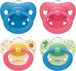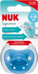 The NUK Signature orthodontic pacifier for children aged 6 to 18 months supports healthy oral development. It features an even flatter shape for better adhesion, is made of high-quality silicone and lightweight plastic. The rounded heart-shaped shield with a blue star motif and an improved ring is gentle on sensitive skin. Includes a durable, reusable case suitable for hygienic microwave cleaning. BPA-free.