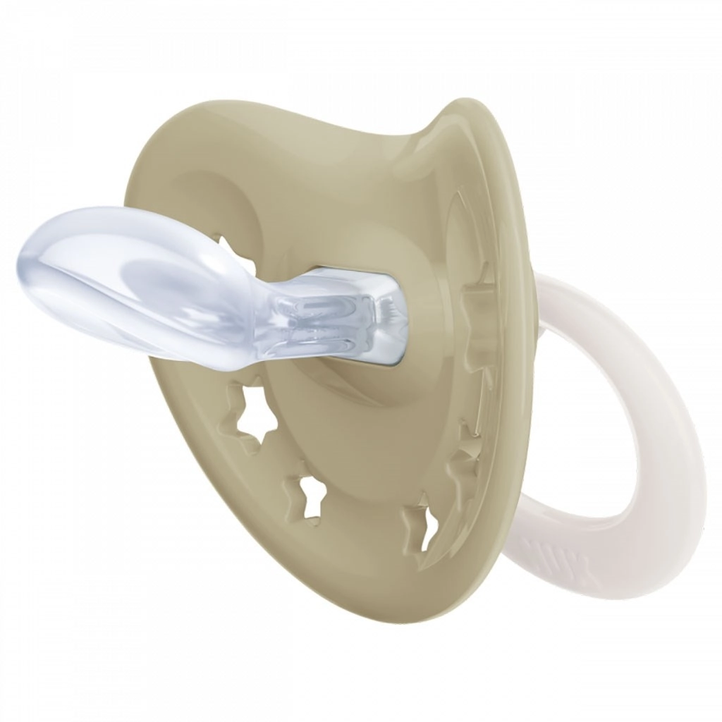 The NUK Signature pacifier in size 2 (6–18 months) combines a popular design with a functional orthodontic shape that respects the child’s natural needs. The even flatter nipple made of soft silicone promotes correct tongue positioning and supports the development of the palate, jaws, and teeth.