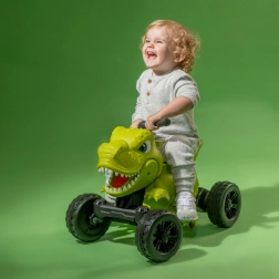 Simple controls enable smooth forward riding up to 3 km/h. Wide wheels and non-slip footrests enhance stability, while the dinosaur sound and moving mouth activated by the lever boost interactive fun. The bright green color also attracts little riders’ attention.