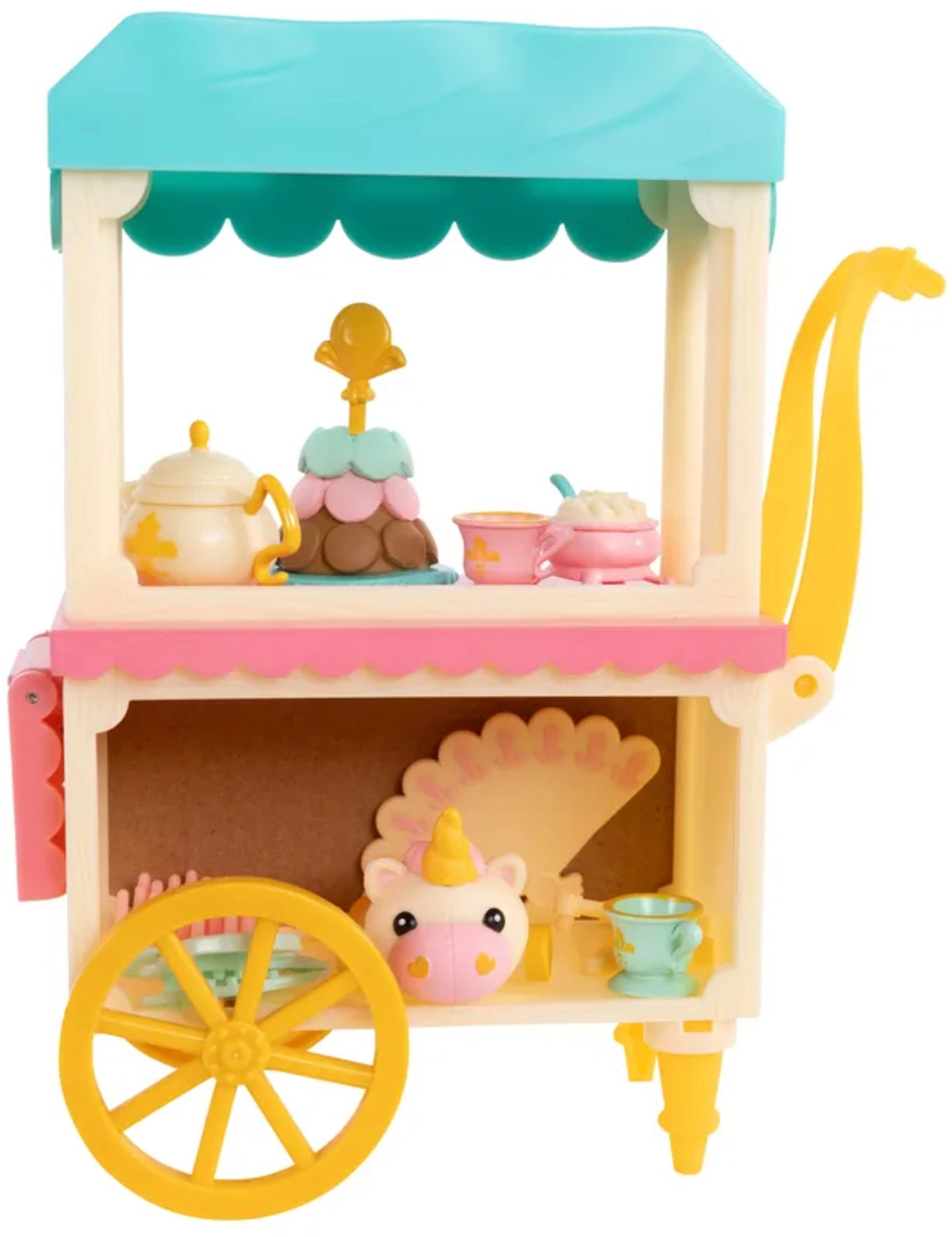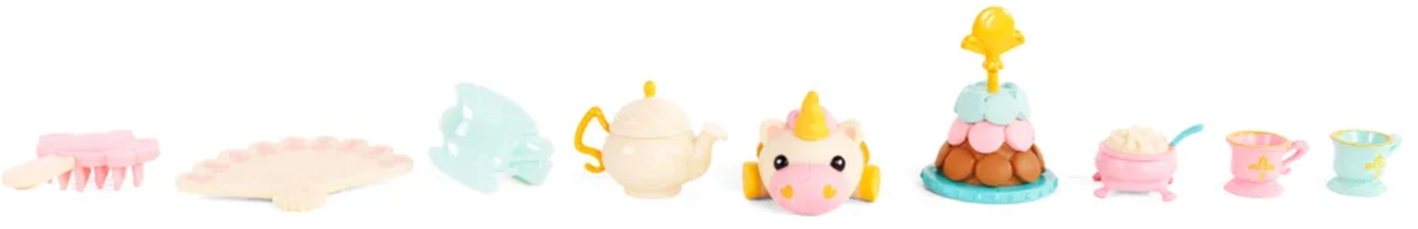 The box includes a tea set, desserts, a comb, a small unicorn, and other little pieces for varied scenes.