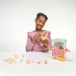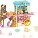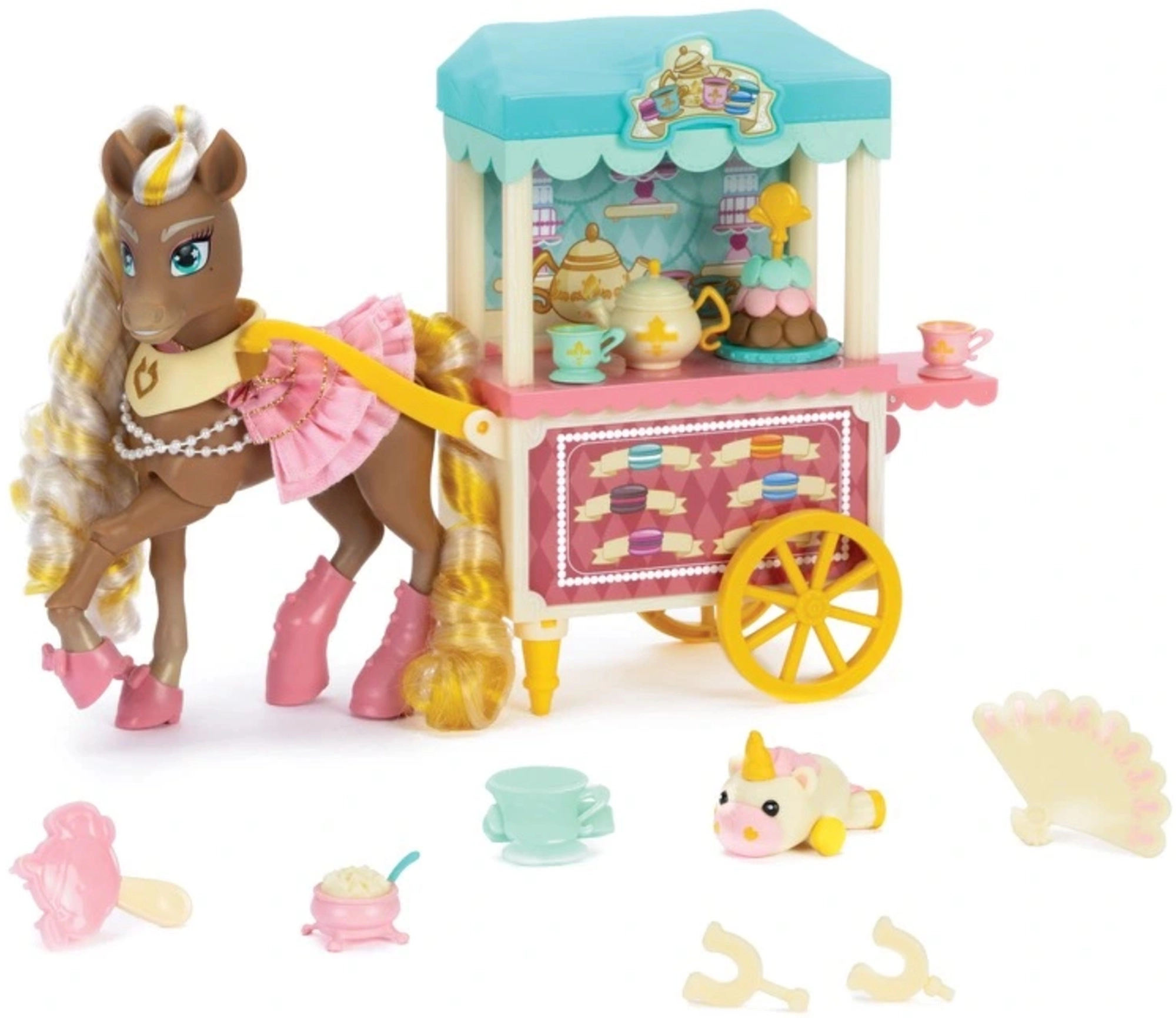 Included is a large Tea & Treats cart with two rolling wheels, a teapot with tea, cups, macarons on a stand, and other cute bits. The cart can be attached to the pony with a tow bar so you can roll into fun. Thanks to the horseshoe-shaped clips, Cherie can firmly hold selected accessories.