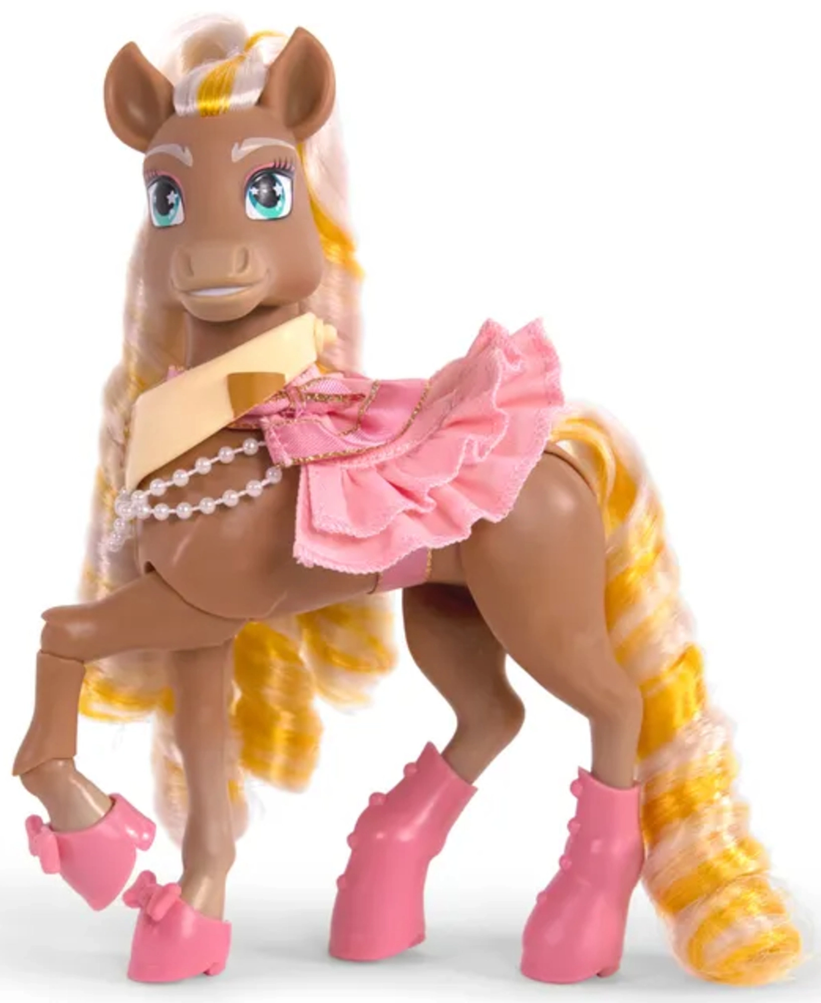 A pony with poseable limbs, a long mane with golden strands, and the ability to hold accessories thanks to horseshoe-shaped clips.