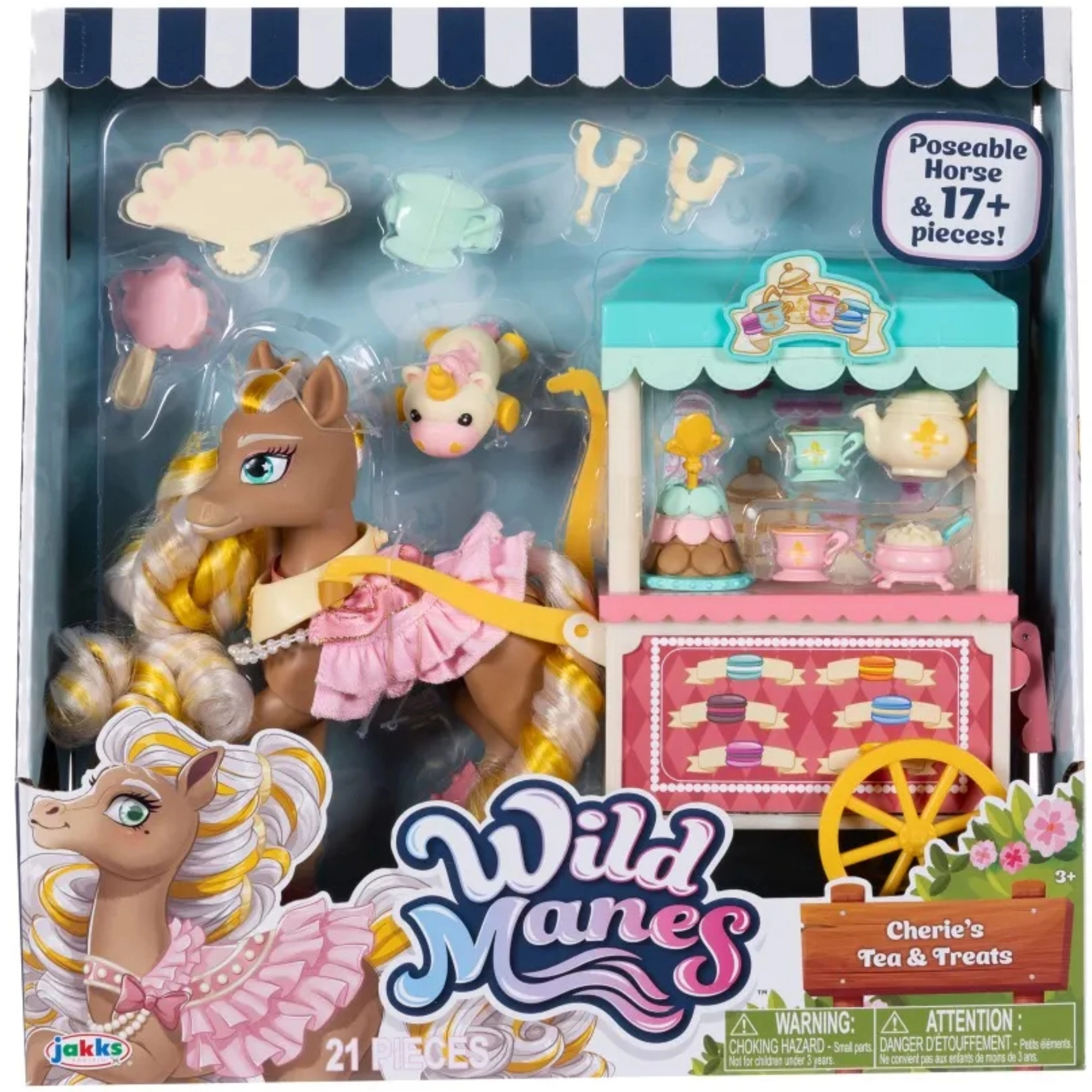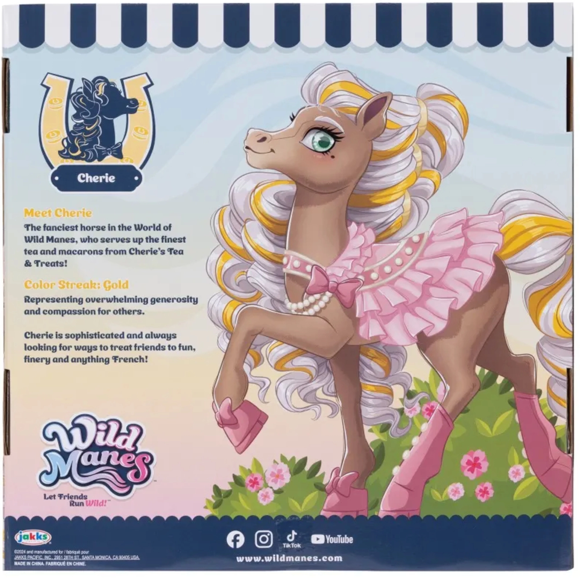 The Cherie figure in a pink skirt and little shoes is ready to start a tea party. Thanks to poseable legs, you can easily set her in different poses and recreate favorite scenes from the world of WILD MANES. The long, wavy mane and tail with golden streaks are perfect for brushing and styling.