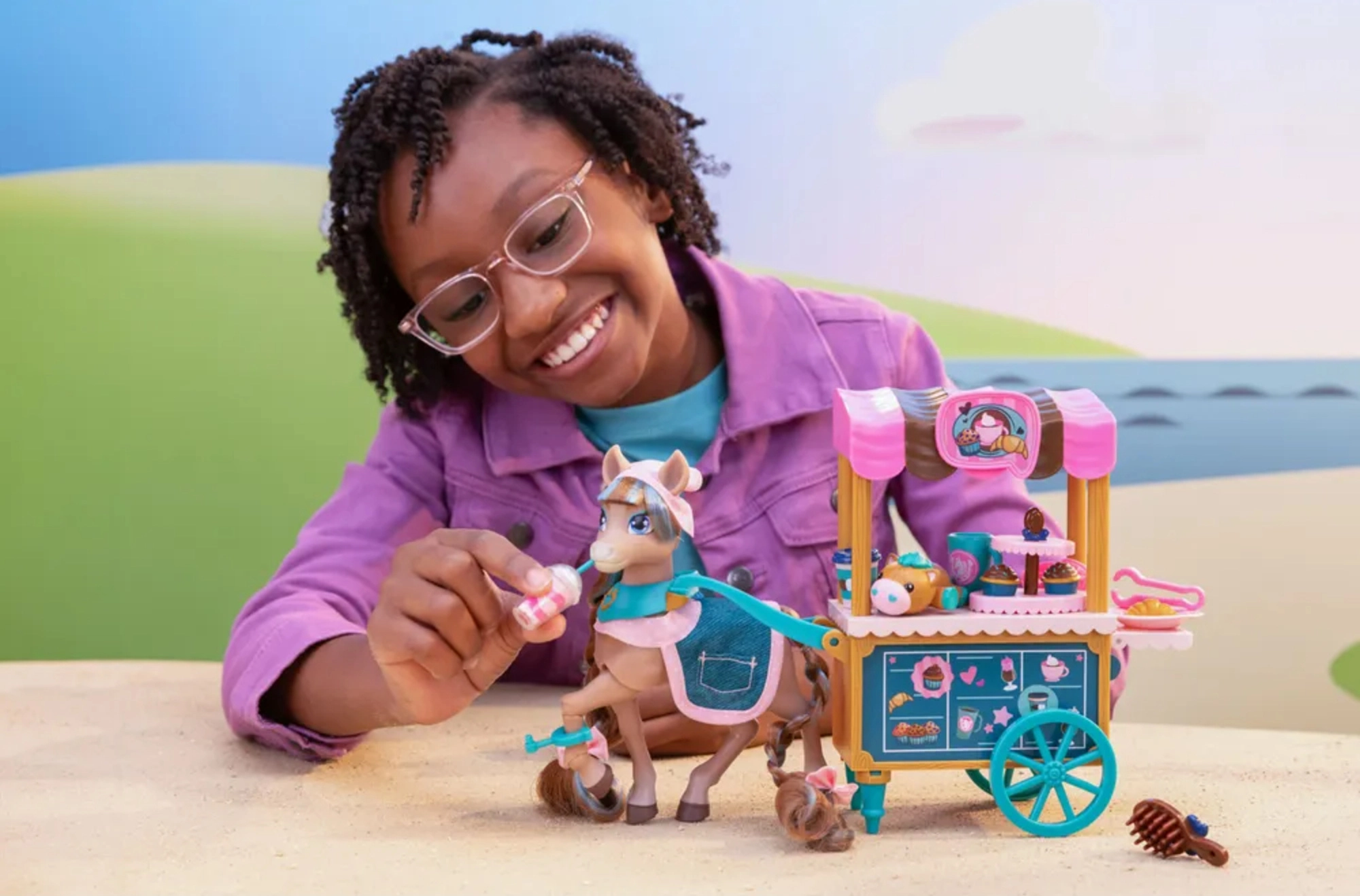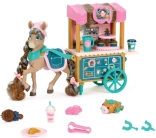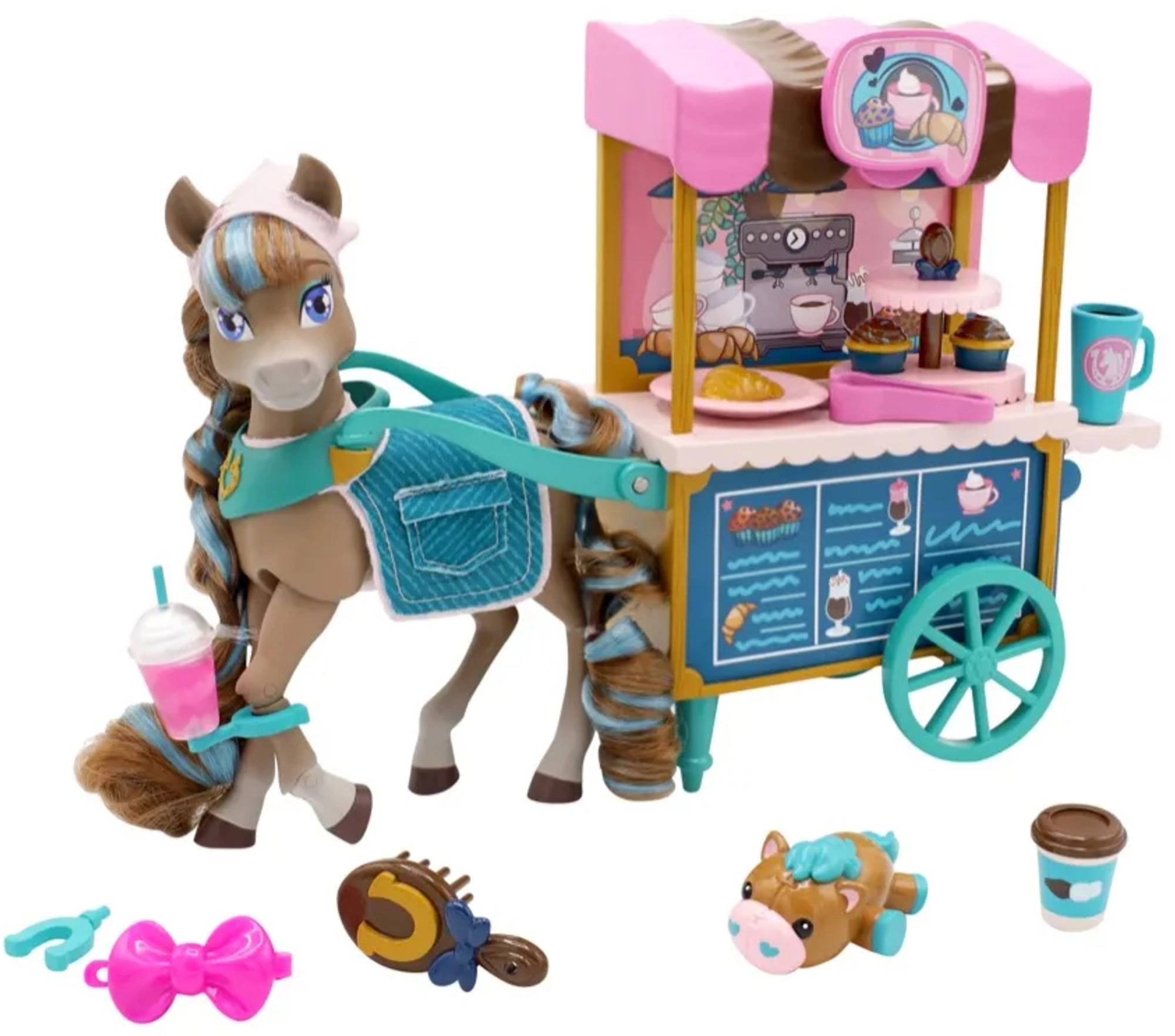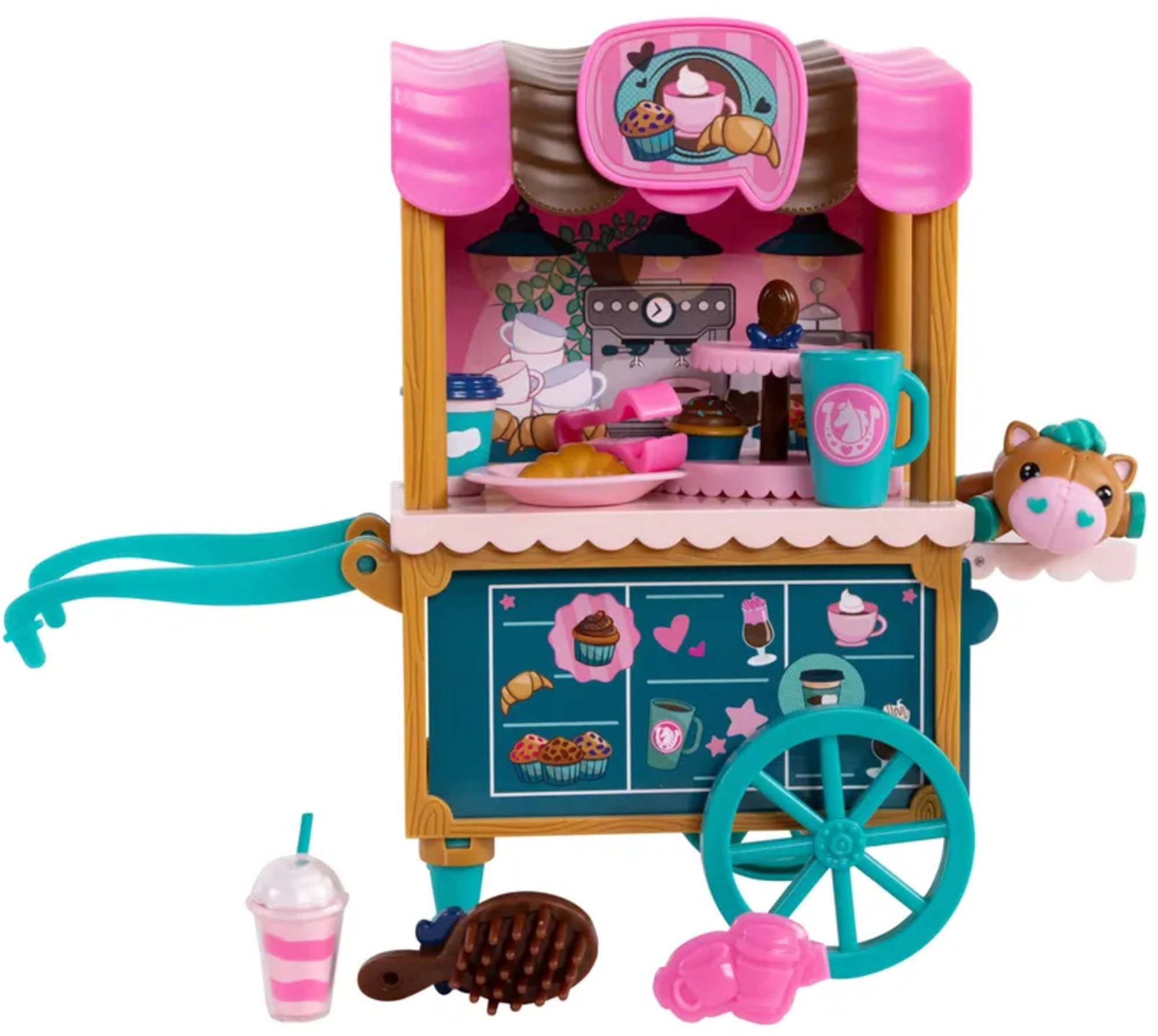 The cart has rolling wheels, a handle, and shelves for treats, plus a colorful canopy and café graphics. The set also includes serving and baking accessories, a small pet, and a brush for mane styling. Everything is designed for creative role-play, fine motor development, and social play.