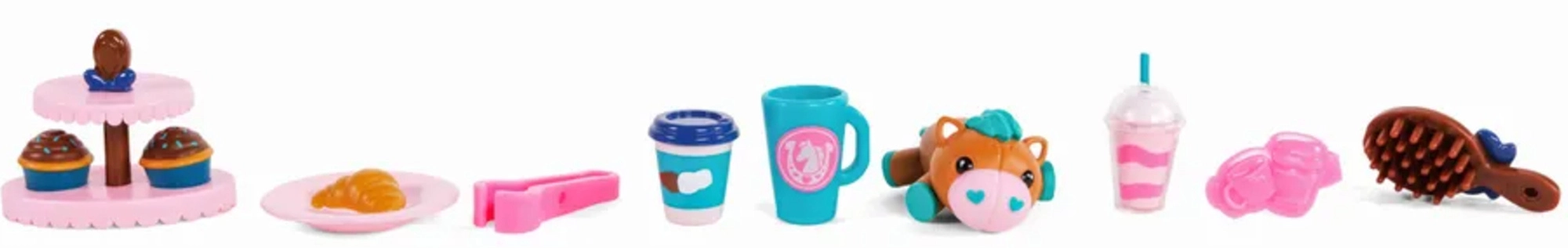 The pony has moveable limbs and can hold accessories thanks to horseshoe-shaped clips. It’s easy to create different café and series-inspired scenes.
