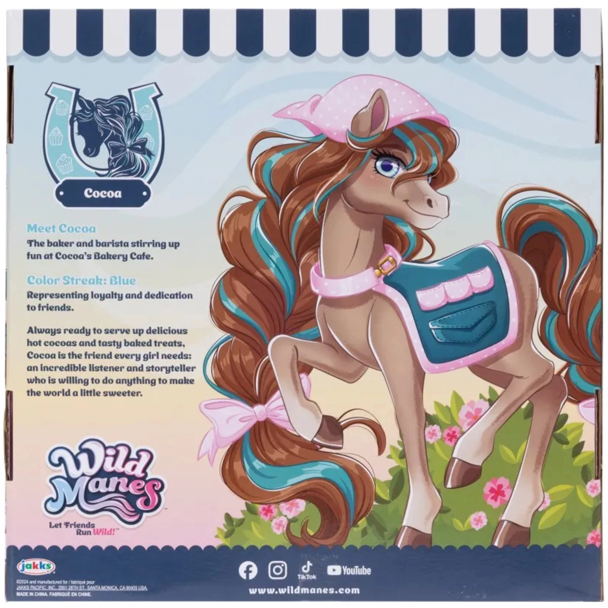 Cocoa the pony from the popular WILD MANES series comes with a detailed Bakery Café cart to serve drinks and pastries. The figure features a finely styled mane with braids, expressive eyes, and a chic apron—ready for any adventure. Thanks to the horseshoe-shaped clips, Cocoa can hold accessories to easily act out different scenes.