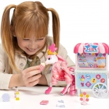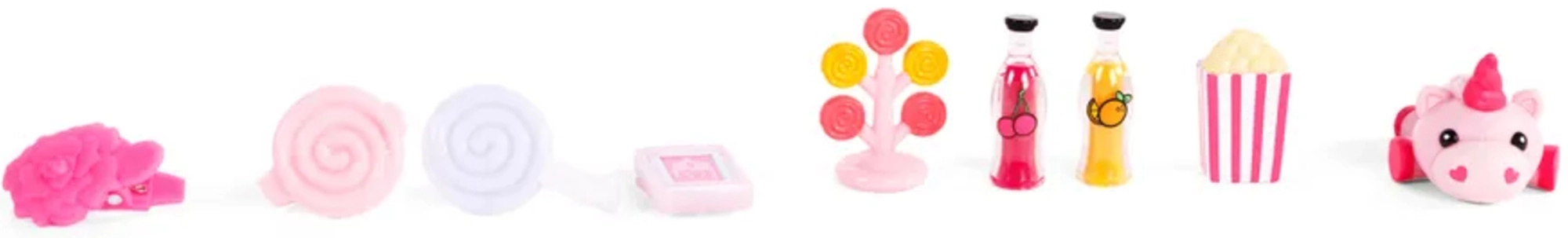 Popcorn, lollipops, drinks, and other small items for realistic play. Includes a brush and hair clips for styling the mane.