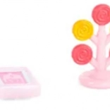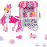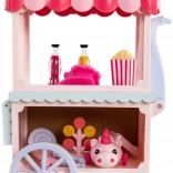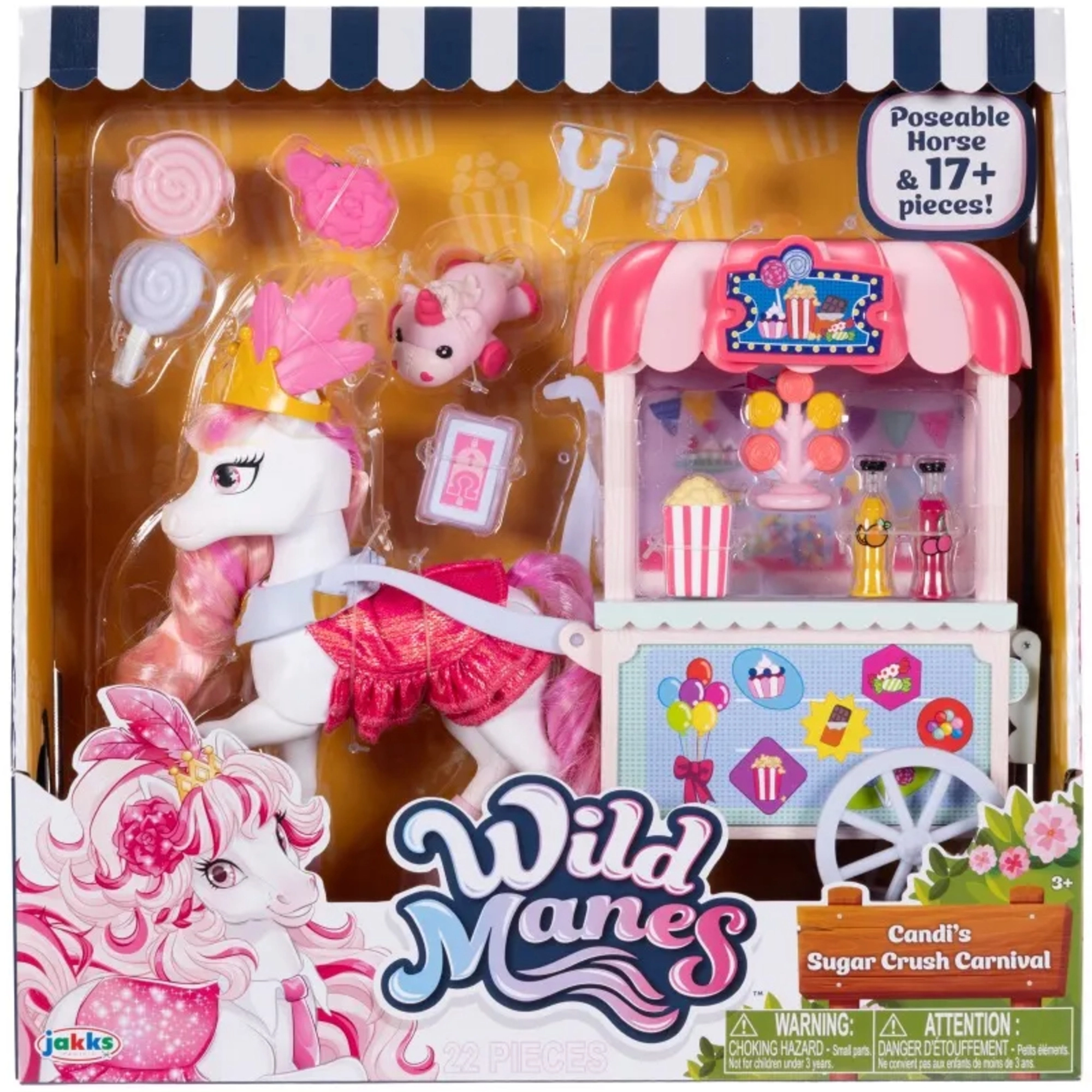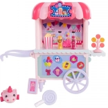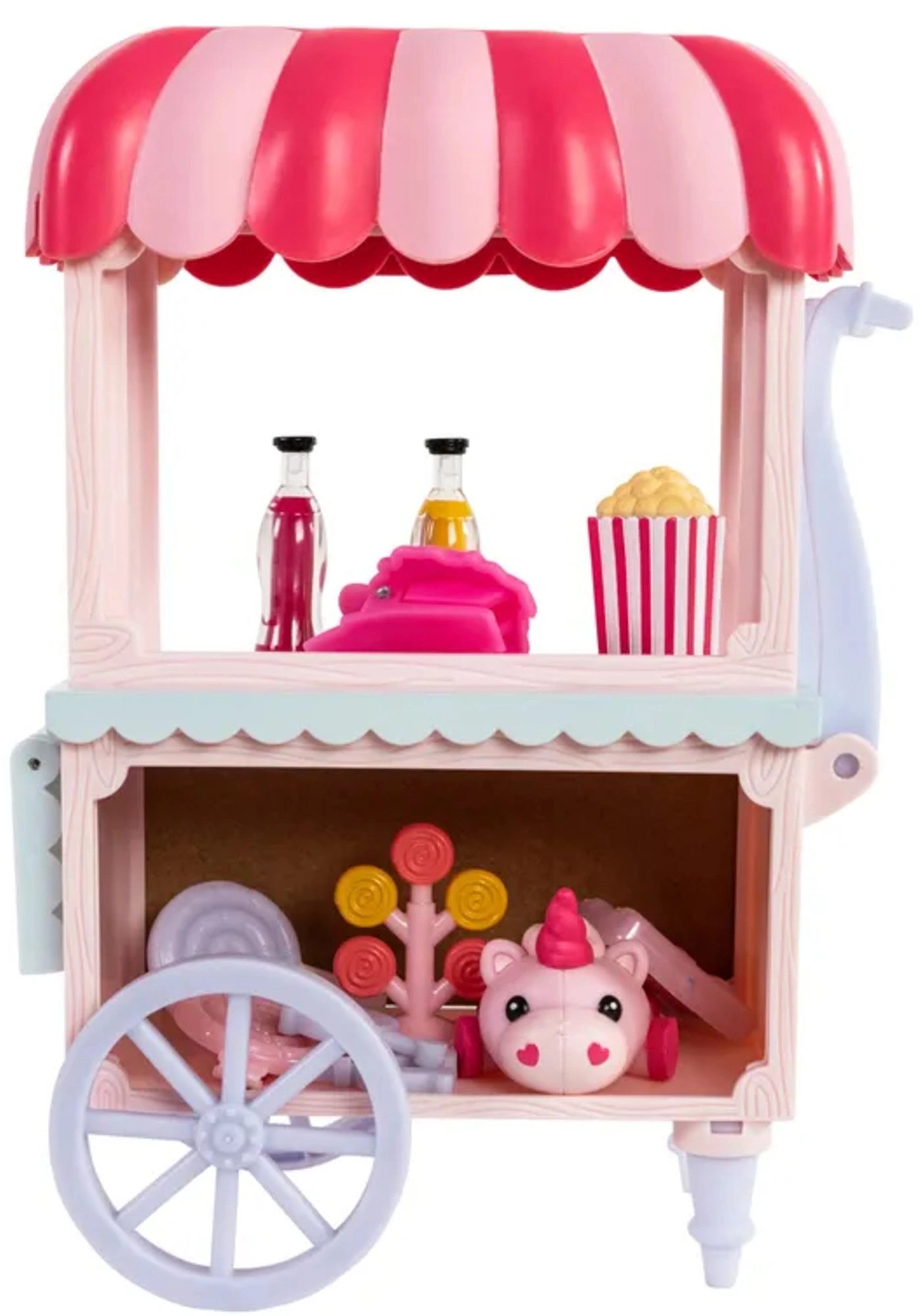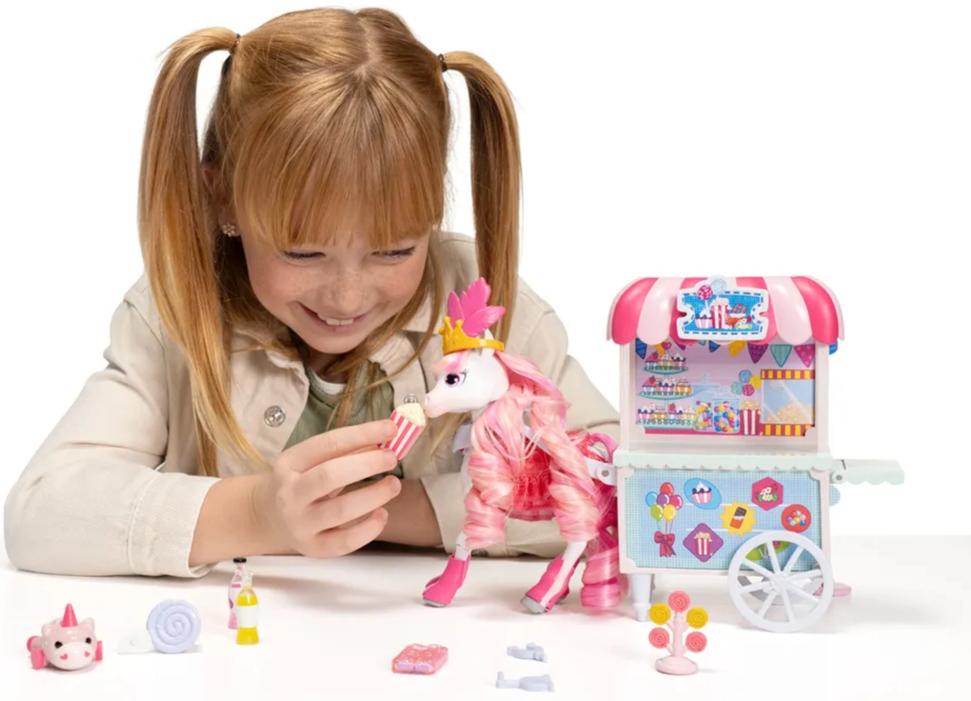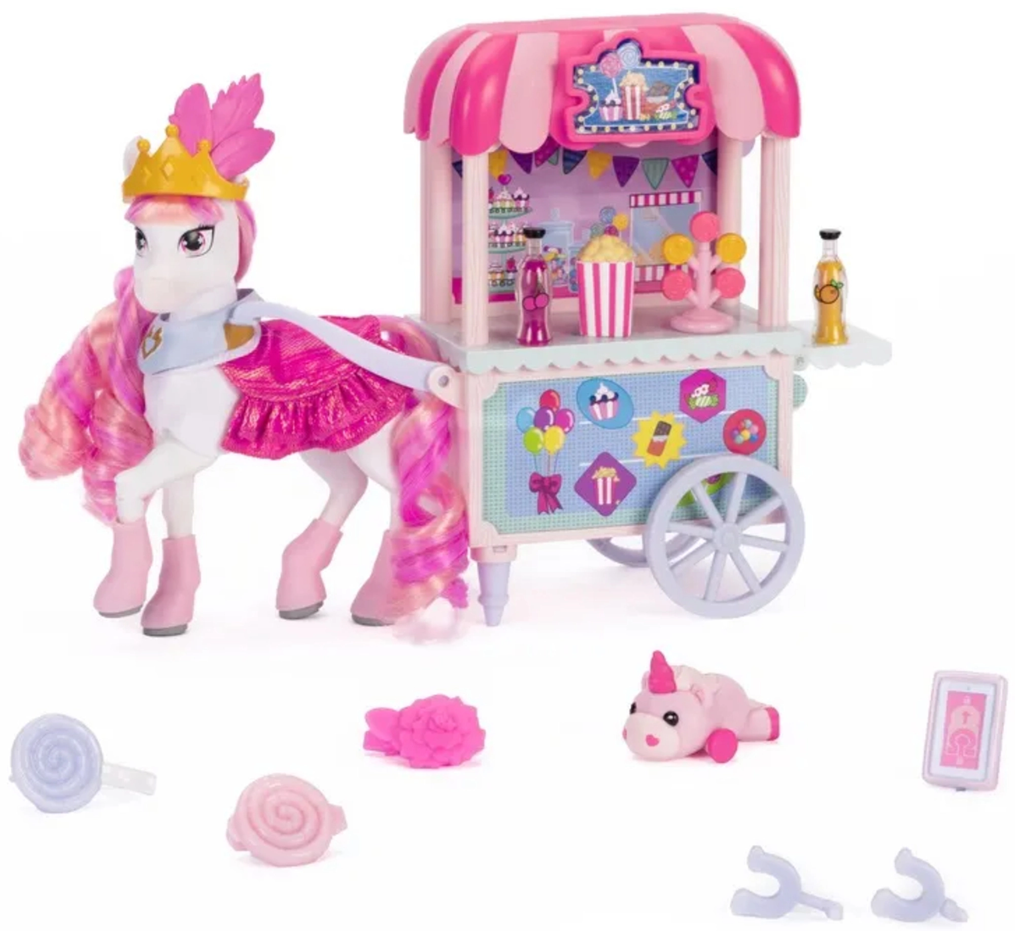 The colorful Sugar Rush Carnival cart with a striped canopy and working wheels is ready to sell popcorn, lollipops, and drinks. Using the tow bar/lead, the cart can be attached to Candi to set off on a sweet ride through Mane Lane. The set also includes small care and styling accessories — a brush, hair clips, and more.