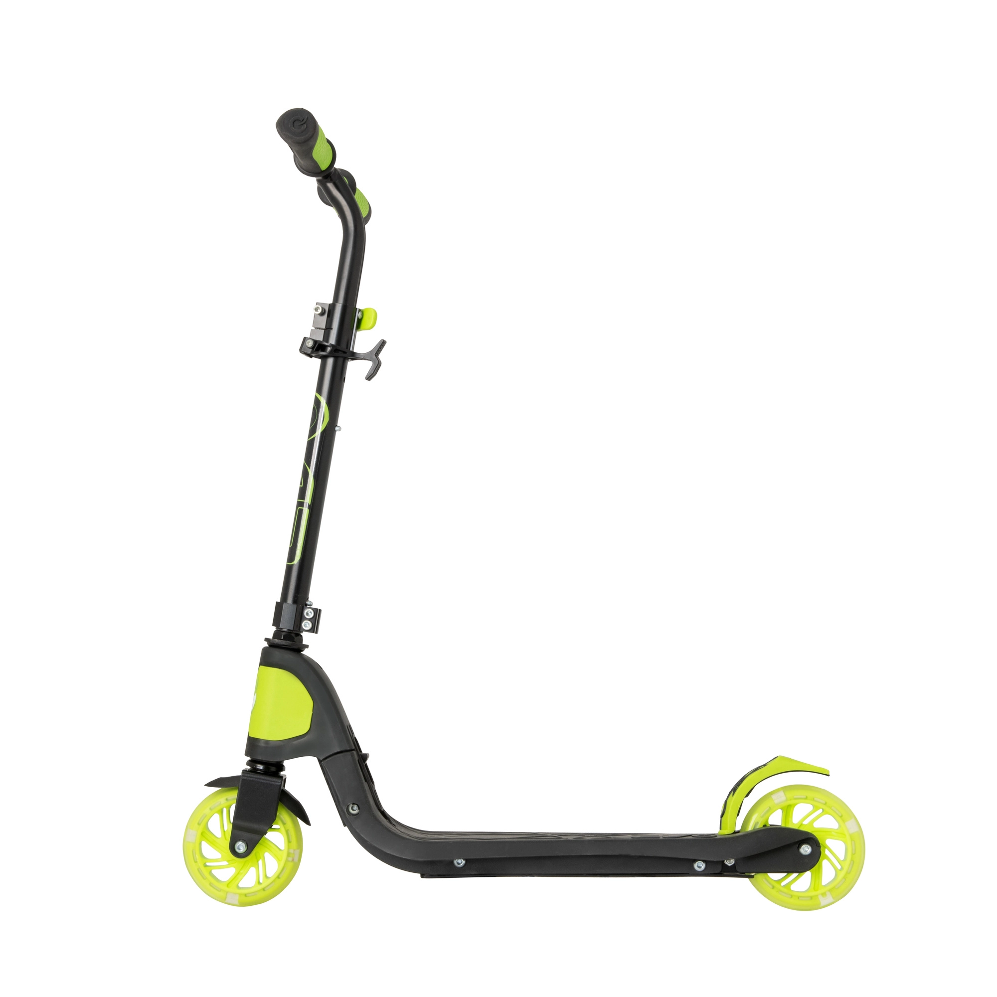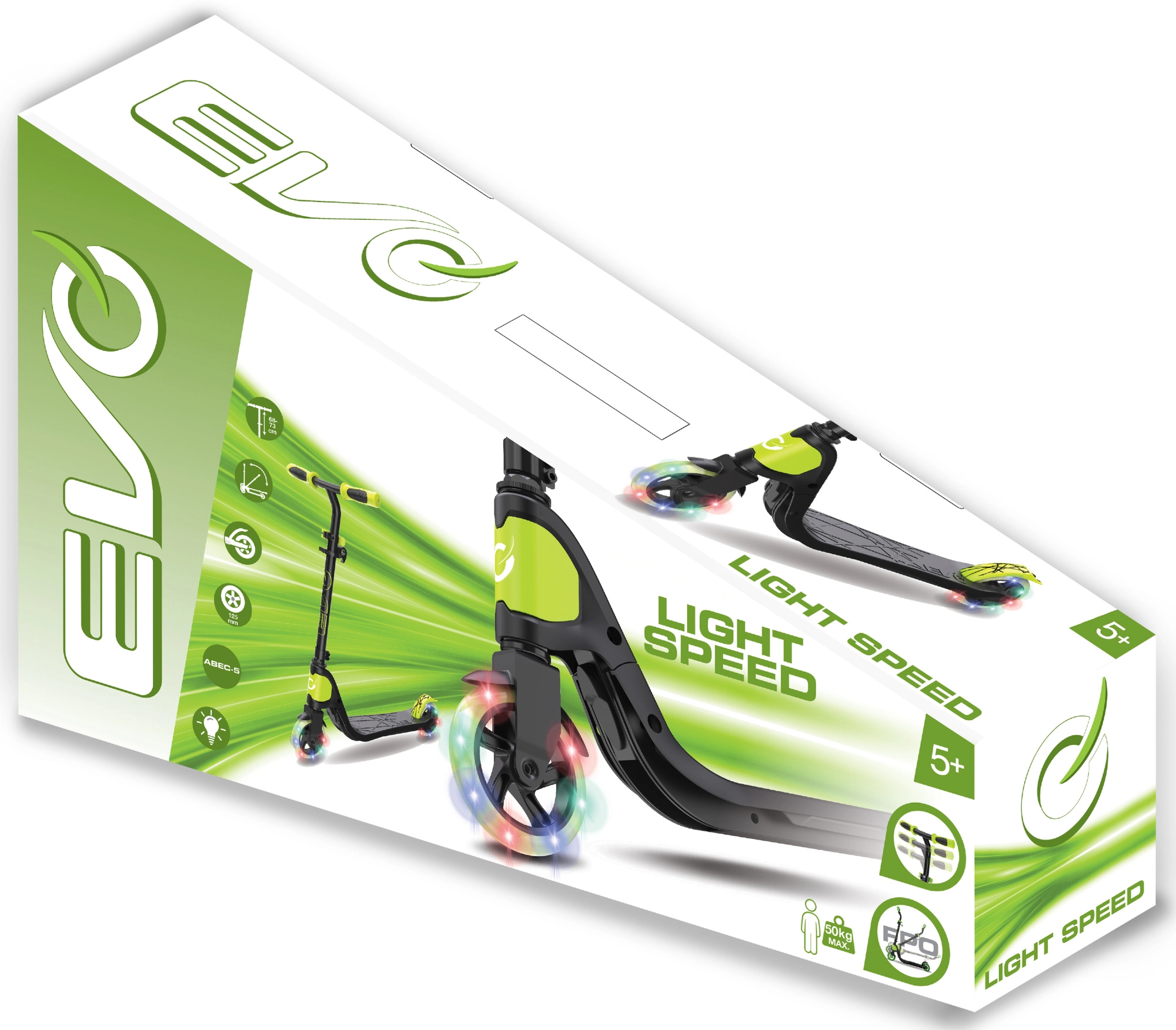 The EVO Light Speed is a great kids’ scooter for everyday rides on sidewalks and at the playground. The adjustable handlebar height (approx. 75–80 cm) grows with your child, the light-up wheels make every ride exciting, and the rear fender also serves as an effective foot brake. Its low weight and foldability make it easy to carry and store.