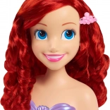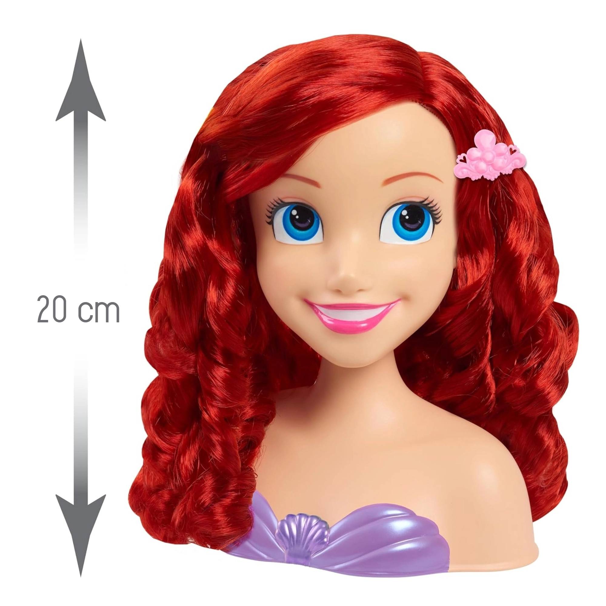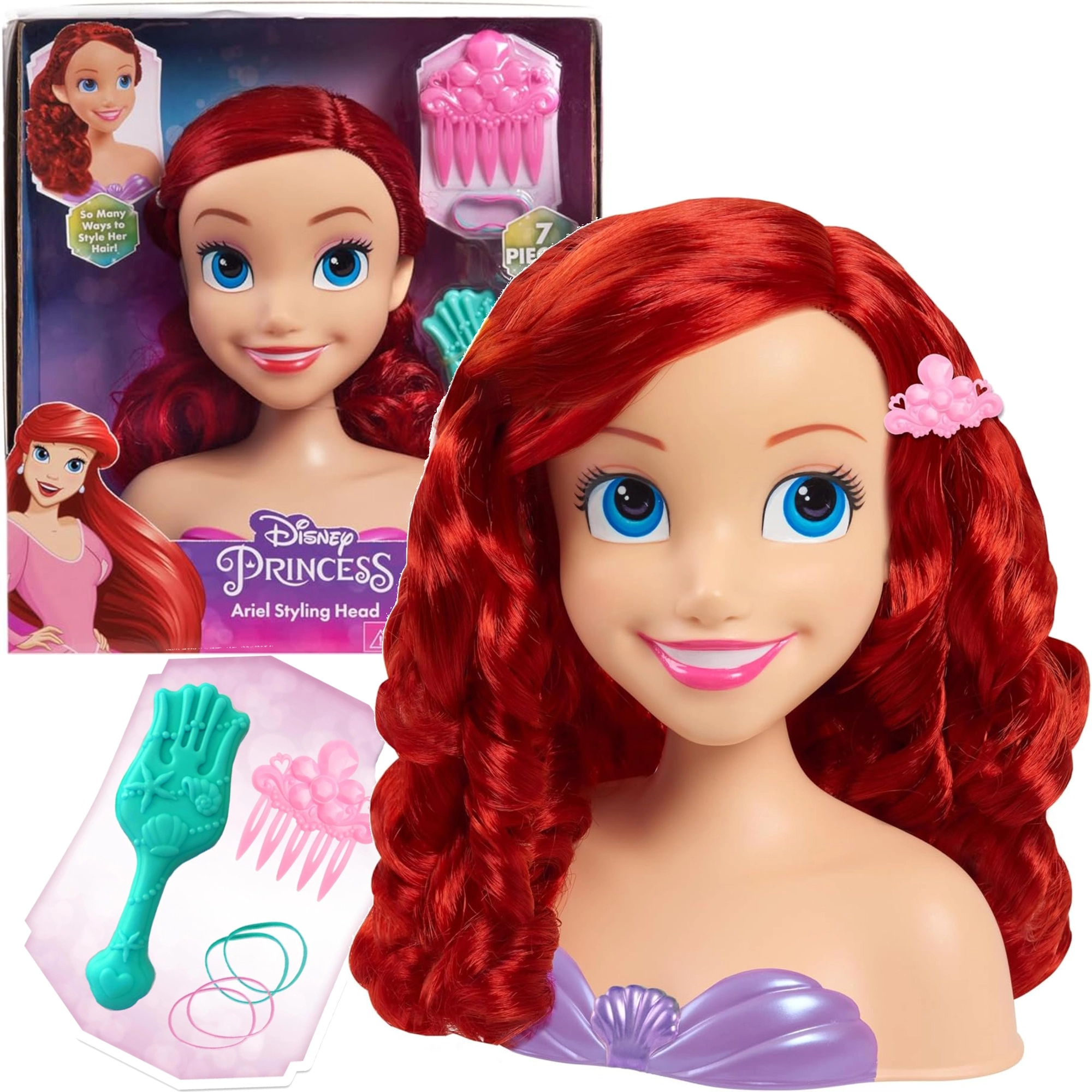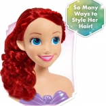 The Disney Princess Ariel styling head faithfully depicts the beloved mermaid with blue eyes and long, curly red hair. A stable plastic bust with a purple seashell top makes styling easier and keeps the head firmly in place so kids can fully enjoy hairdressing play.
