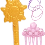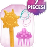 The set includes a sun-shaped brush, a decorative comb, and hair elastics for everyday styles and royal ball looks alike. Playing with the styling head supports creative development, hand–eye coordination, and builds patience while making braids and waves.