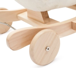 The plush body, padded seat, and wooden handles provide comfort and a safer hold even for the smallest riders.
