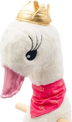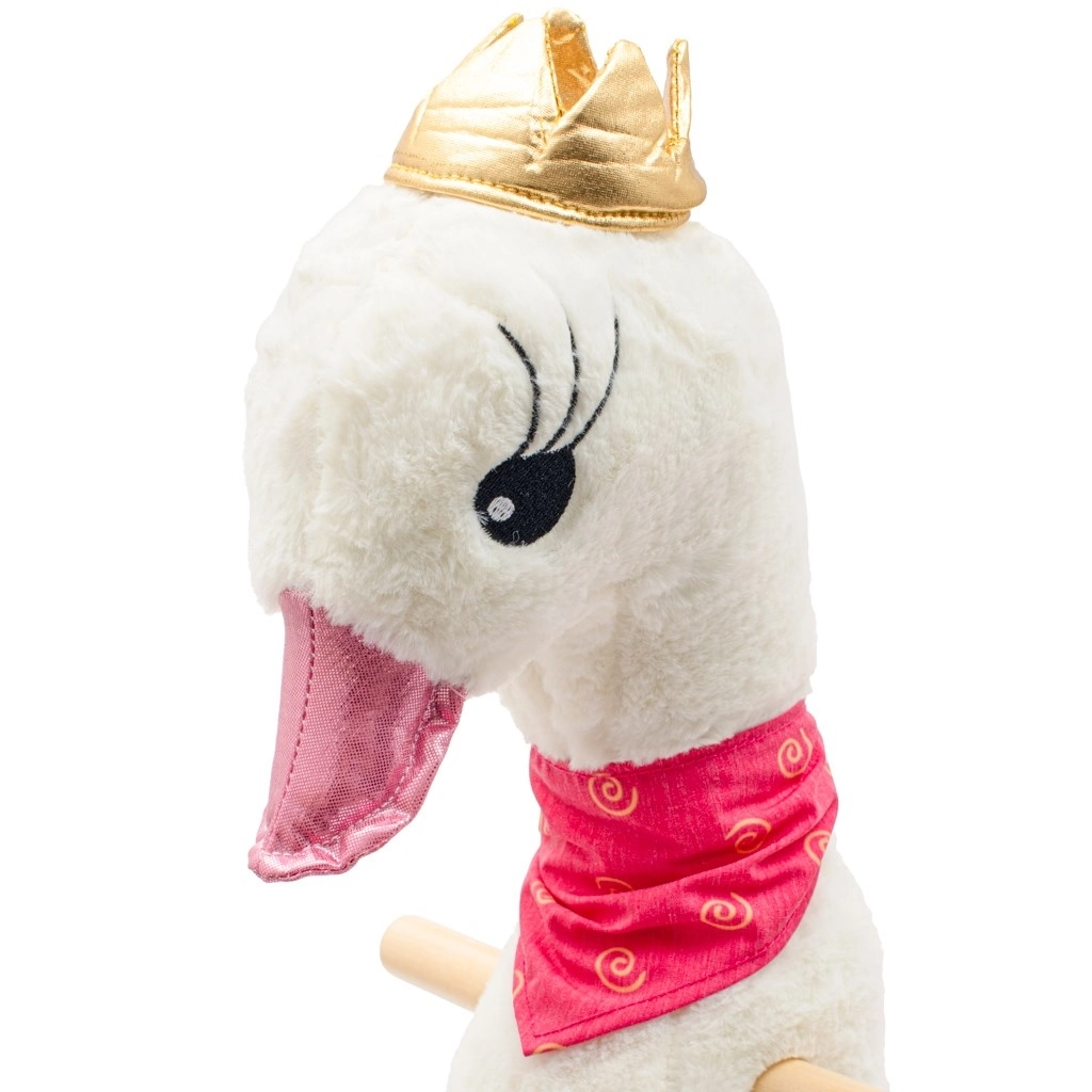 This elegant white swan with pink details and a golden crown will enchant little princesses and their parents. The toy is made from soft, pleasant materials, while the wooden base with wheels allows easy switching between rocking and riding. The integrated melody supports sensory development and adds a new dimension to play.