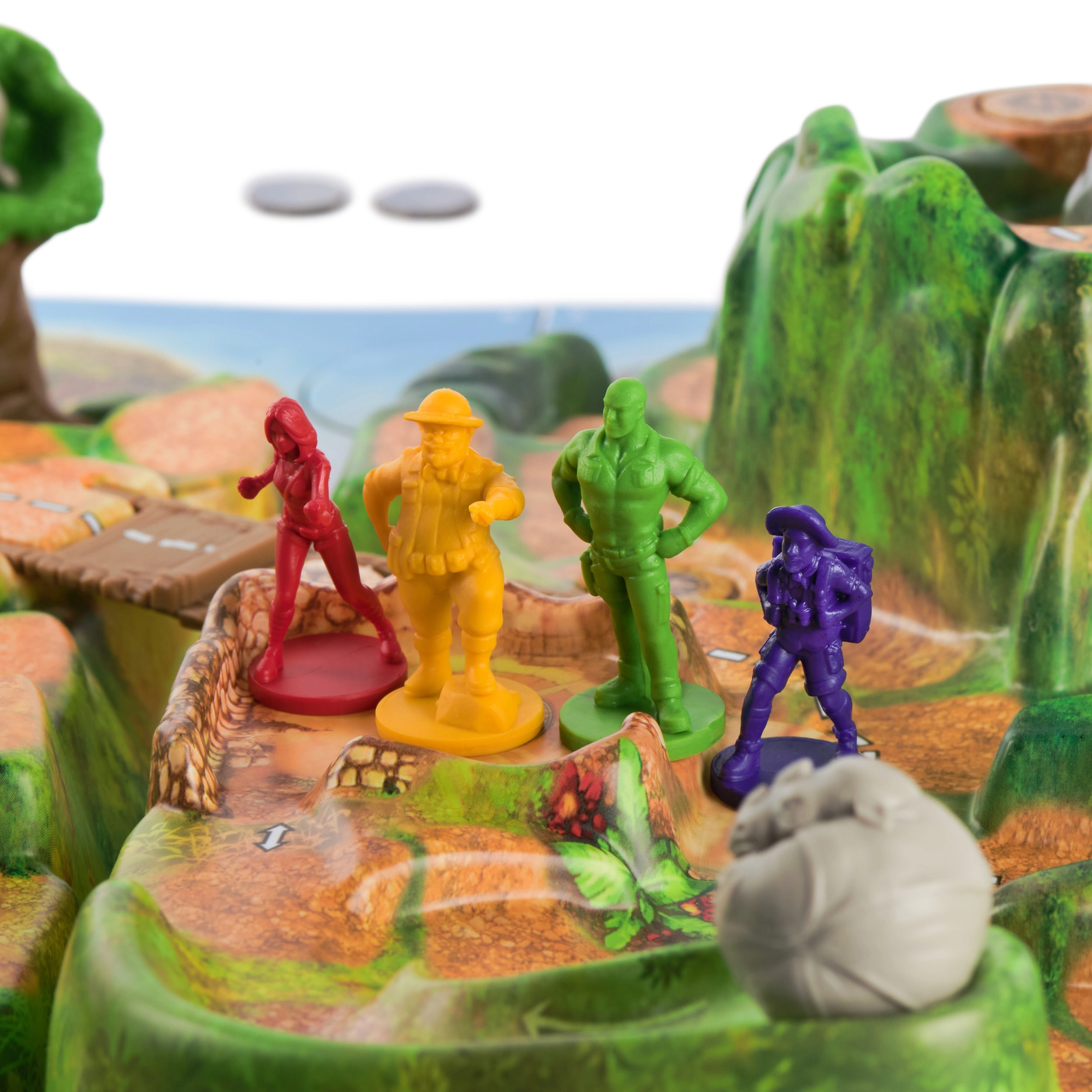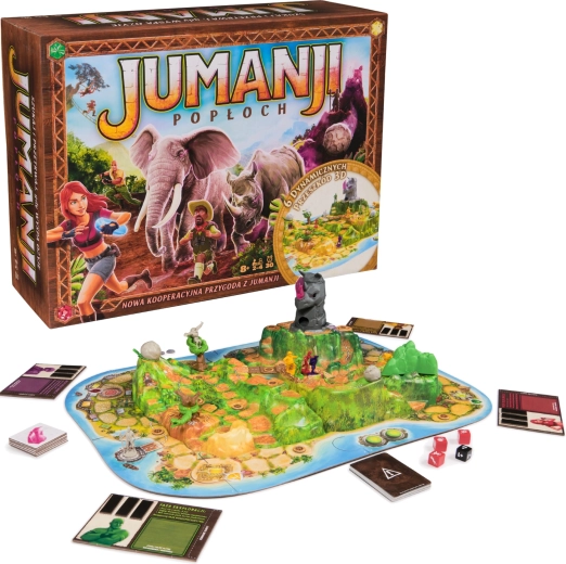 A rampaging elephant, a leaping baboon, a rolling boulder, and predators on the paths—each element adds tension and variety to the game. Colorful figures and tokens enhance the Jumanji atmosphere.