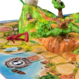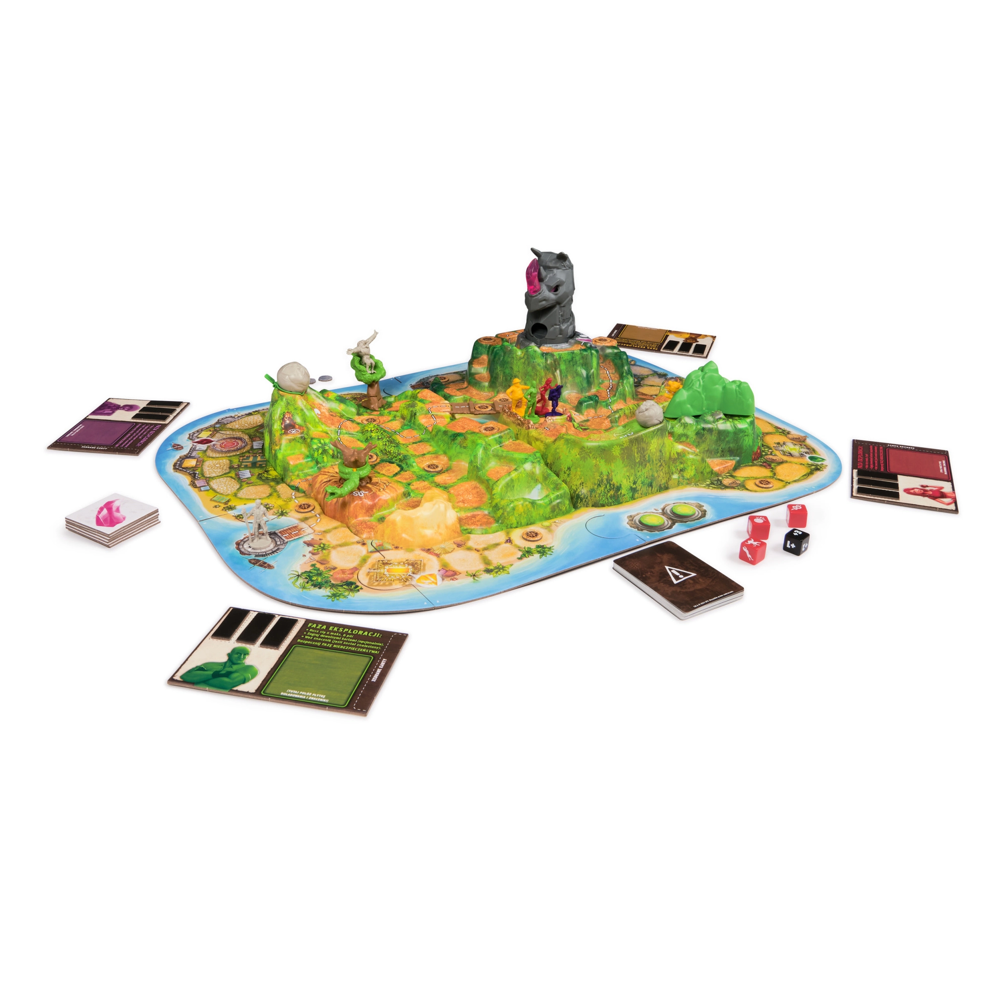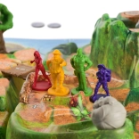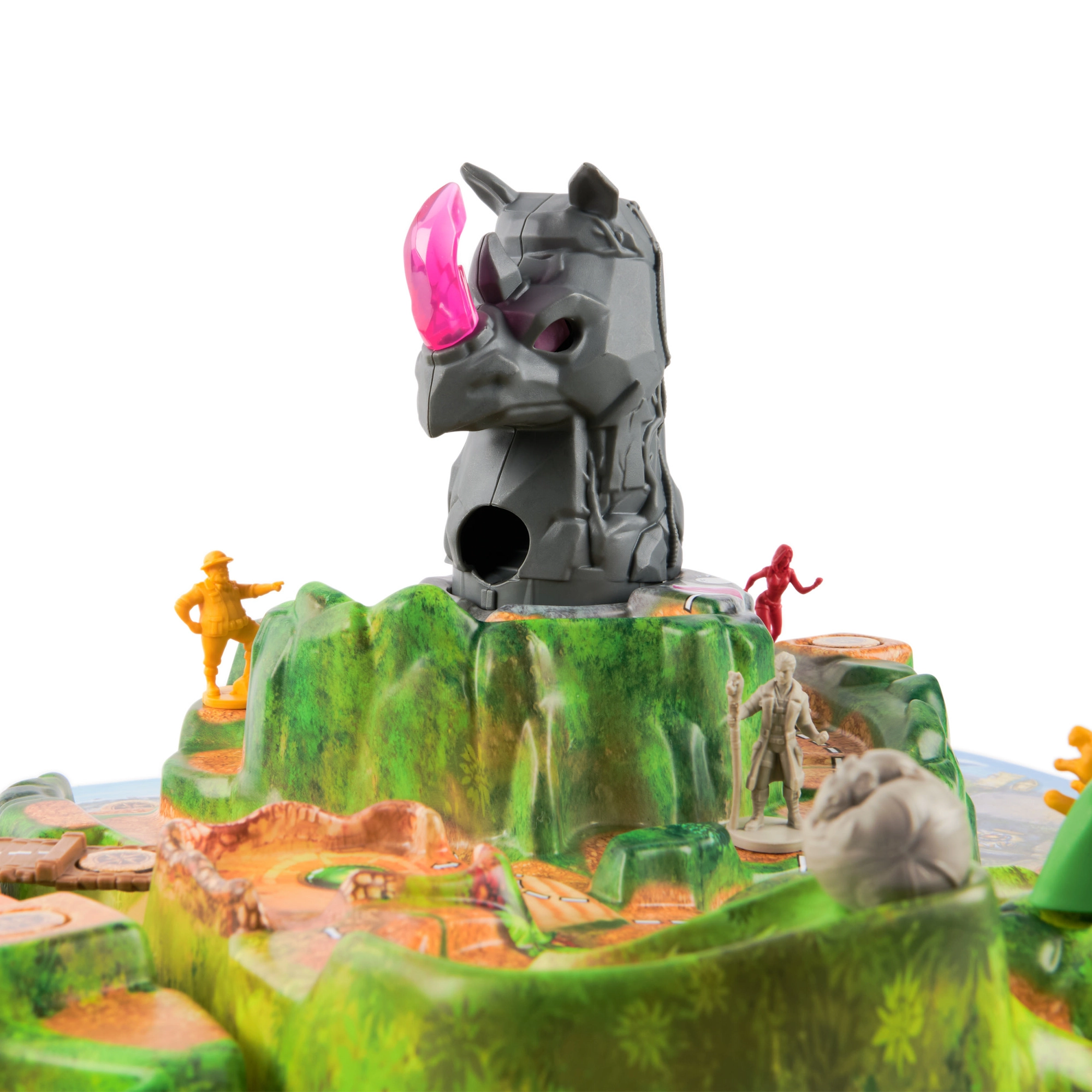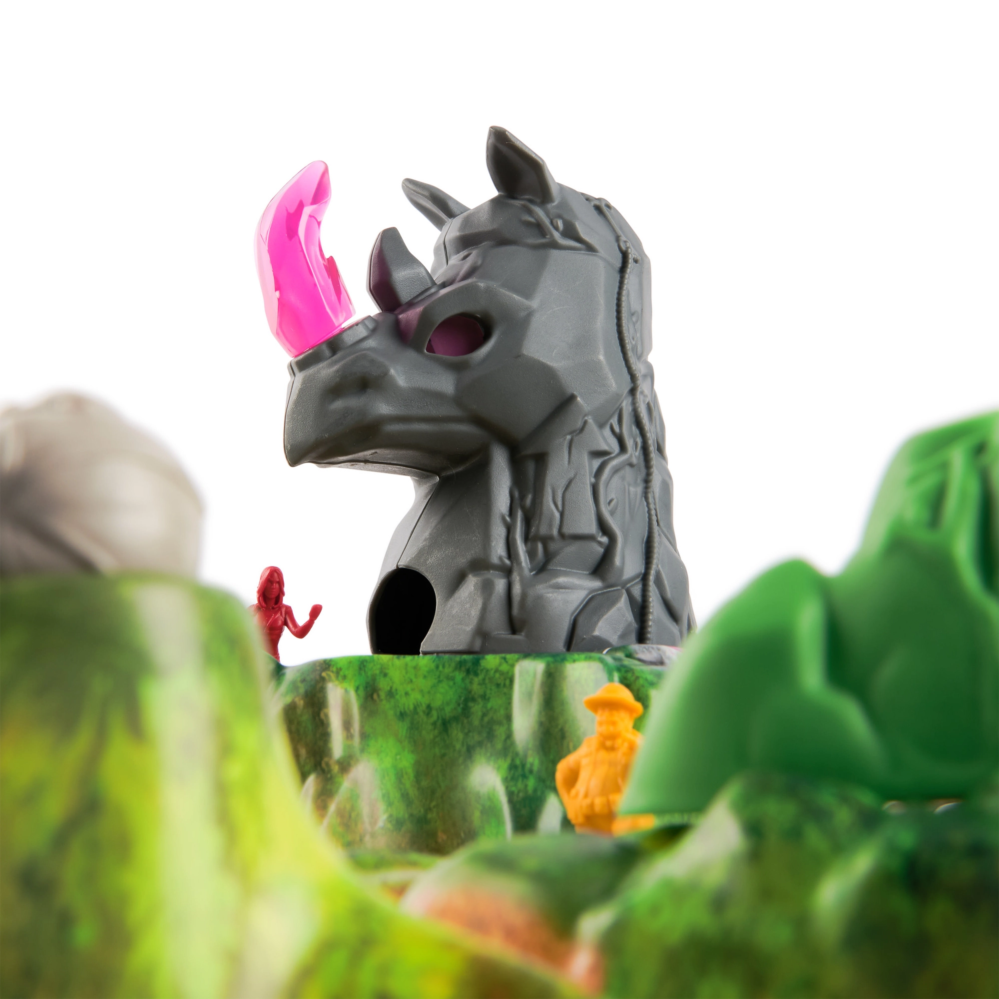 The centerpiece of the board is the striking 3D Rhino Mountain with a crystal horn. Elevated terrain, bridges, and paths create an immersive adventure and a clearly guided flow of play.