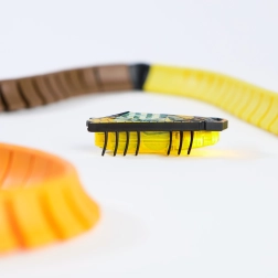The micro-robot with a translucent yellow body lights up and, thanks to vibrations, briskly “scurries” along the track and on flat surfaces. Fun light effects invite play.